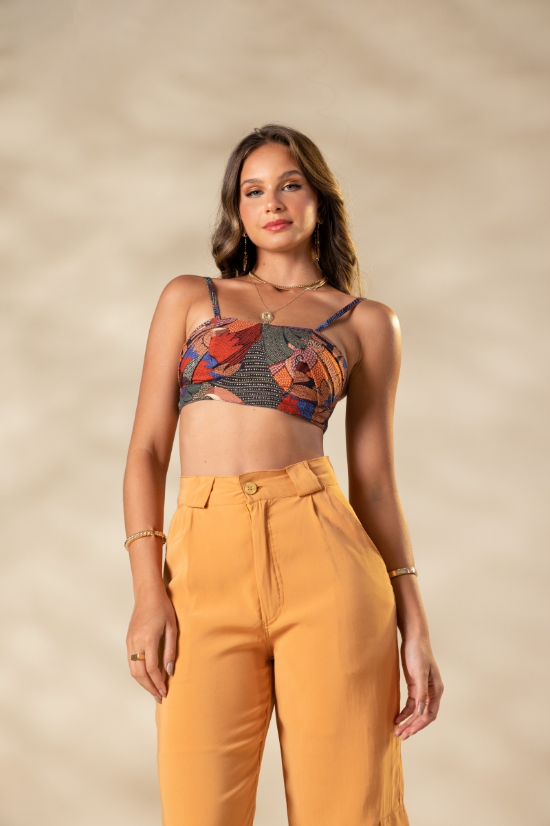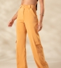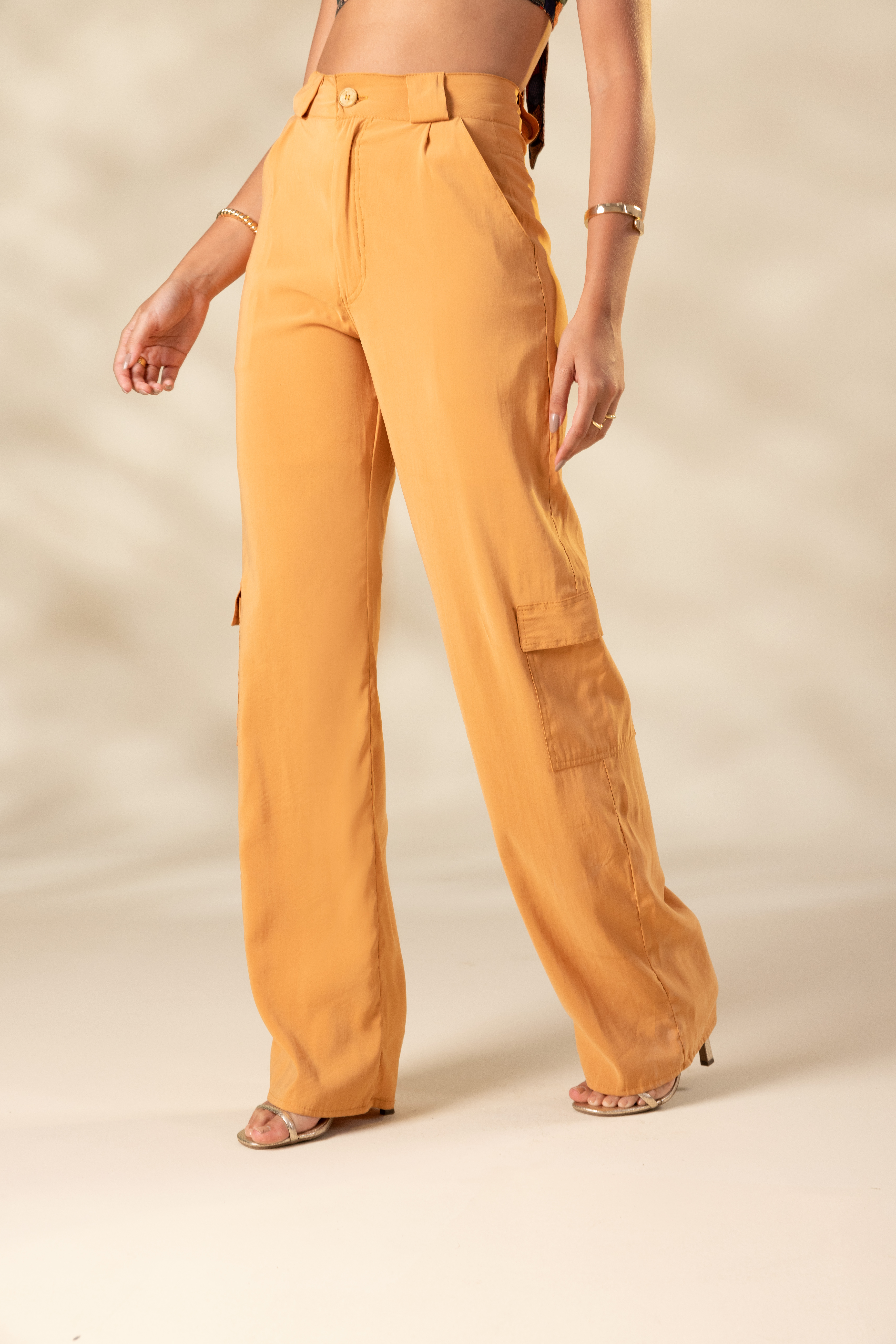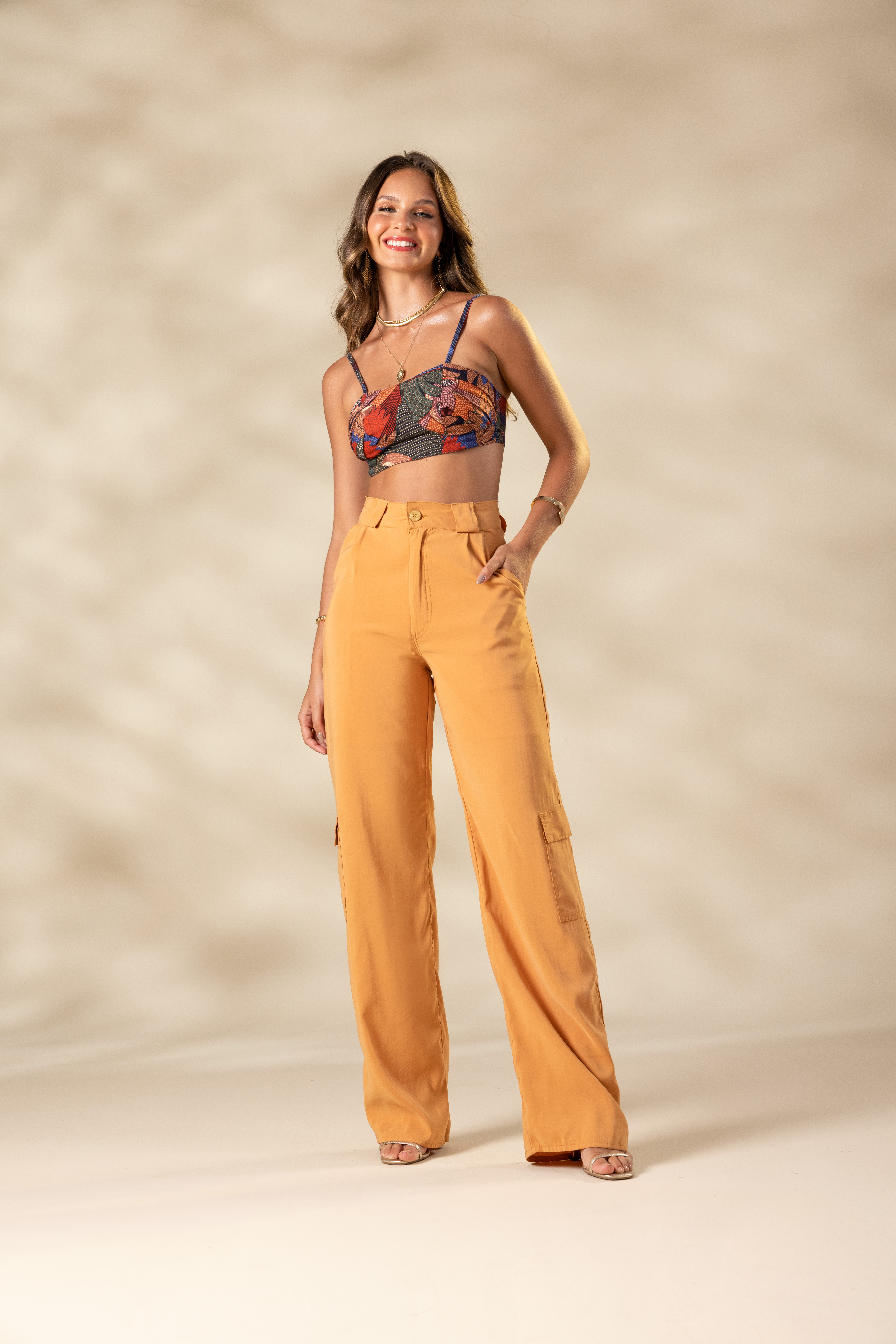 Calça Cargo desenvolvida em tecido viscose com poliéster, modelagem cintura alta, bolsos laterais e passantes largos no cós.