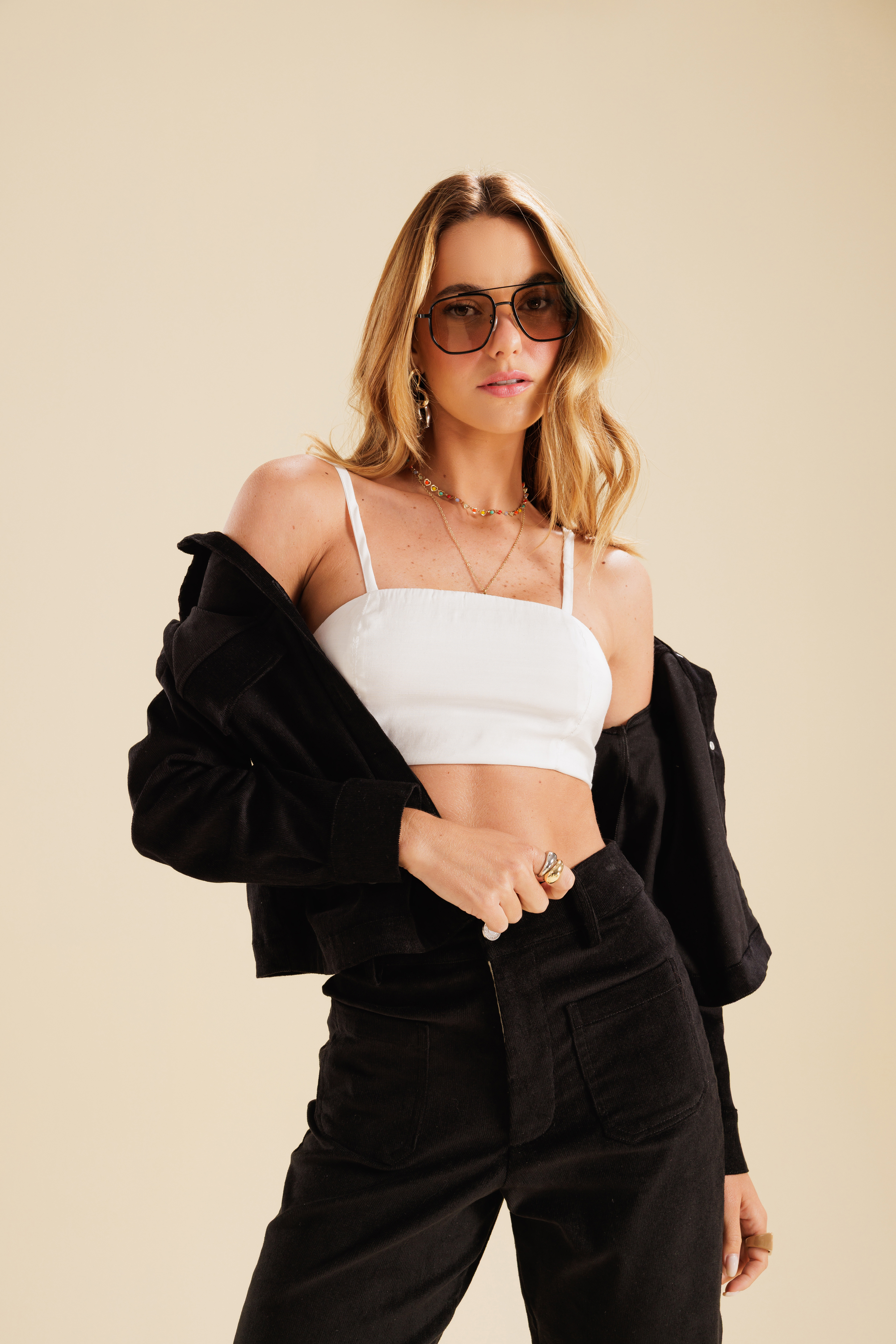 A Jaqueta Cotelê preta tem um toque macio e estruturado, o tecido de algodão com elastano garante conforto e ajuste ao corpo. O modelo curto traz um ar moderno e funciona como sobreposição tanto com looks despojados quanto mais alinhados.