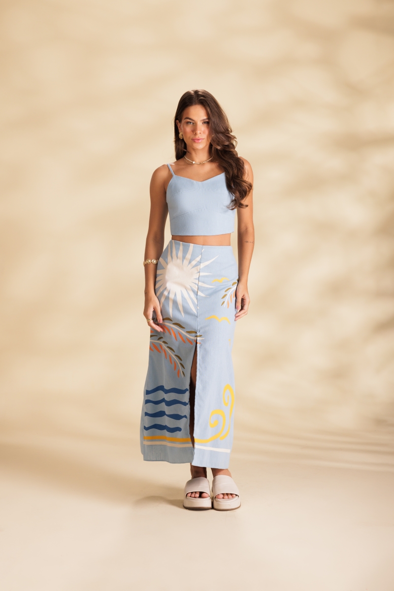 Cropped Água Azul com alcinhas finas e recorte frontal que valoriza o shape. Confeccionado em tecido encorpado com toque natural, que mistura poliéster, viscose, linho e algodão. Possui zíper destacável nas costas.
