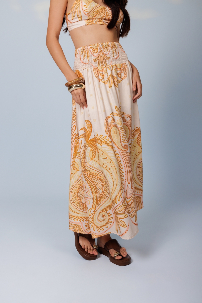 Saia Tropicália em tecido 100% viscose com estampa e caimento leve. Possui cós todo em lastex, que se ajusta bem ao corpo e garante conforto no uso. Um modelo descomplicado e cheio de movimento pro dia a dia.