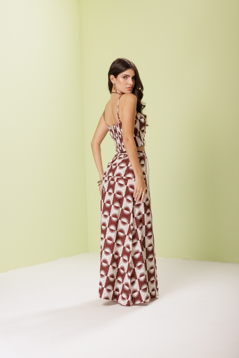 Corset Marrom Solar com alças finas, recortes frontais que estruturam a peça e detalhe em lastex nas costas para melhor ajuste. Possui fechamento com zíper destacável na parte de trás. Confeccionado em tecido 55% algodão e 45% viscose.