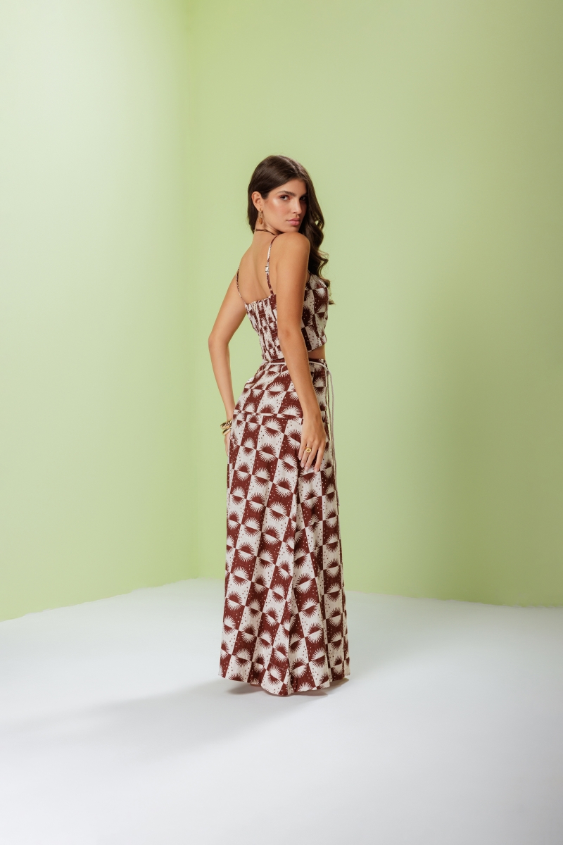 Saia Midi Marrom Solar em tecido 55% algodão e 45% viscose, com torçal para amarração na cintura. O modelo tem caimento reto e estampa geométrica com sol estilizado, trazendo um visual marcante e versátil.
