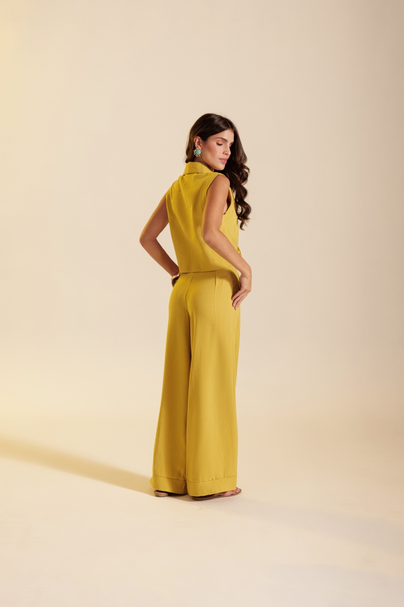 Cropped Alfaiataria Alure sem mangas, com gola lapela e fechamento frontal por botões bombê forrados no mesmo tecido. Confeccionado em tecido 91% viscose e 9% poliéster.