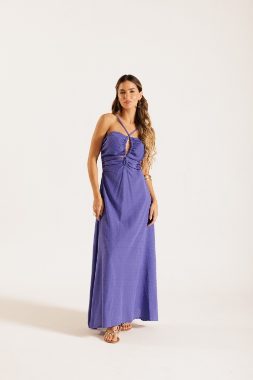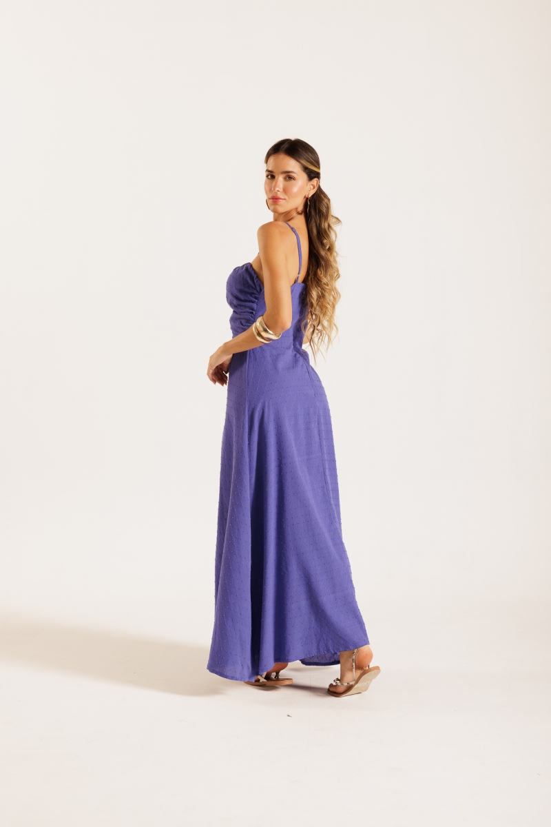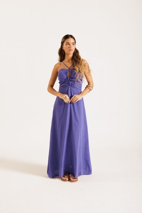 Vestido Midi Jacquard Azul, com alças finas cruzadas no decote. Possui franzido frontal que cria detalhe no busto e recorte sutil abaixo do colo. Confeccionado em tecido leve de 70% algodão e 30% viscose.