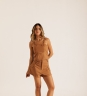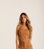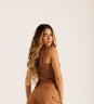 Corset Linen Castanho, com alças duplas finas e recortes frontais que estruturam a peça. Possui zíper destacável nas costas e pequena fenda abaixo do fechamento. Confeccionado em 70% viscose e 30% linho.