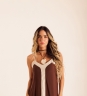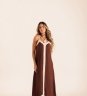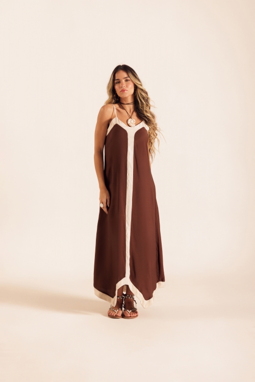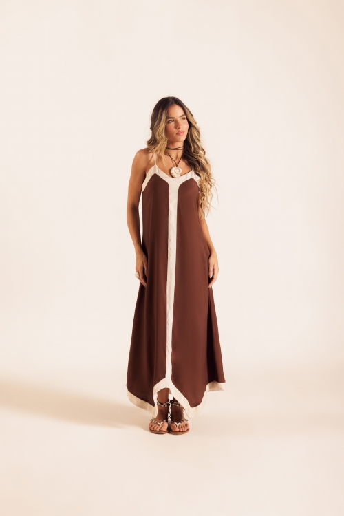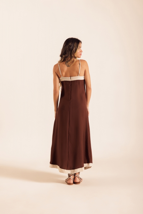 Vestido Midi Duo Essence de alças finas, com detalhe contrastante na barra e no recorte frontal. Fechamento nas costas com zíper. Confeccionado em tecido 90% viscose e 10% poliéster.
