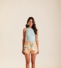 Short Jeans Flores Tropicais em 100% algodão, estampa floral multicolorida e barra com viés. Conta com bolsos e fechamento por botão e zíper.