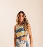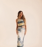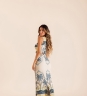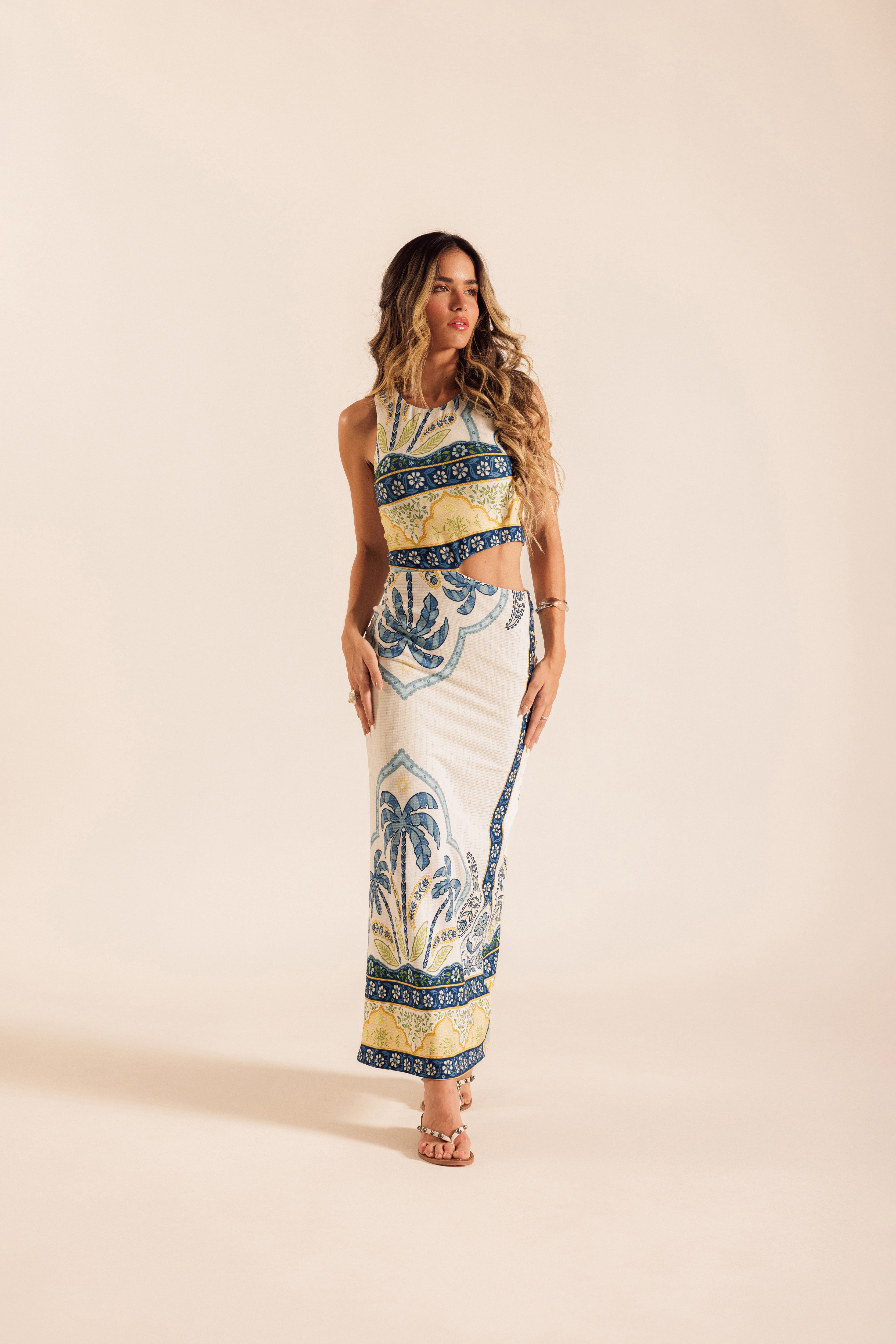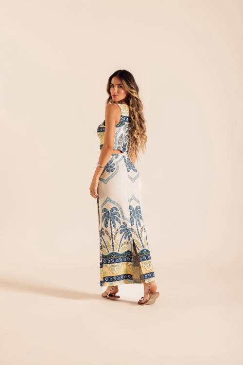 Vestido Longuete Oásis em tecido canelado (91,5% viscose e 8,5% elastano), com modelagem ajustada, estampa localizada, recorte lateral na cintura e fenda na saia.