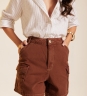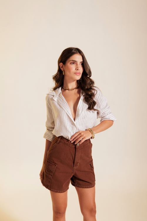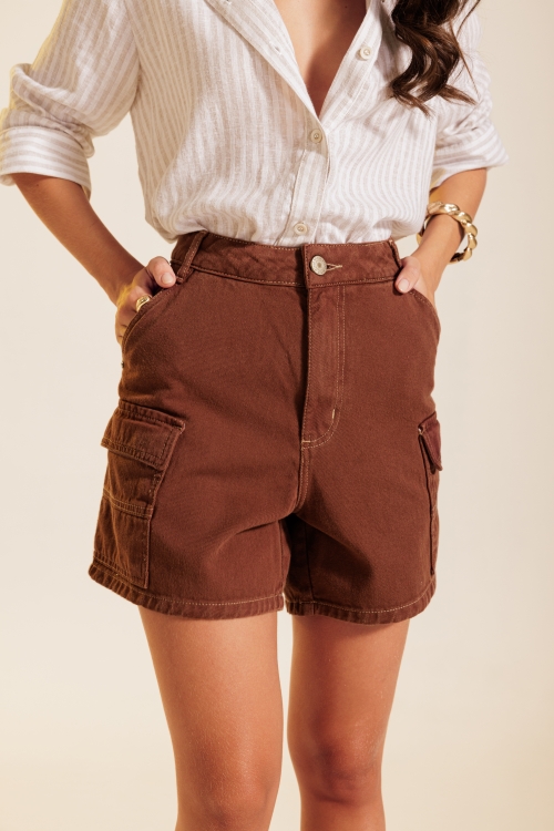 Bermuda Cargo Choco de comprimento pedal, com bolso faca tradicional na frente, bolsos laterais e traseiros com aba no estilo cargo. Confeccionado em tecido 100% algodão.