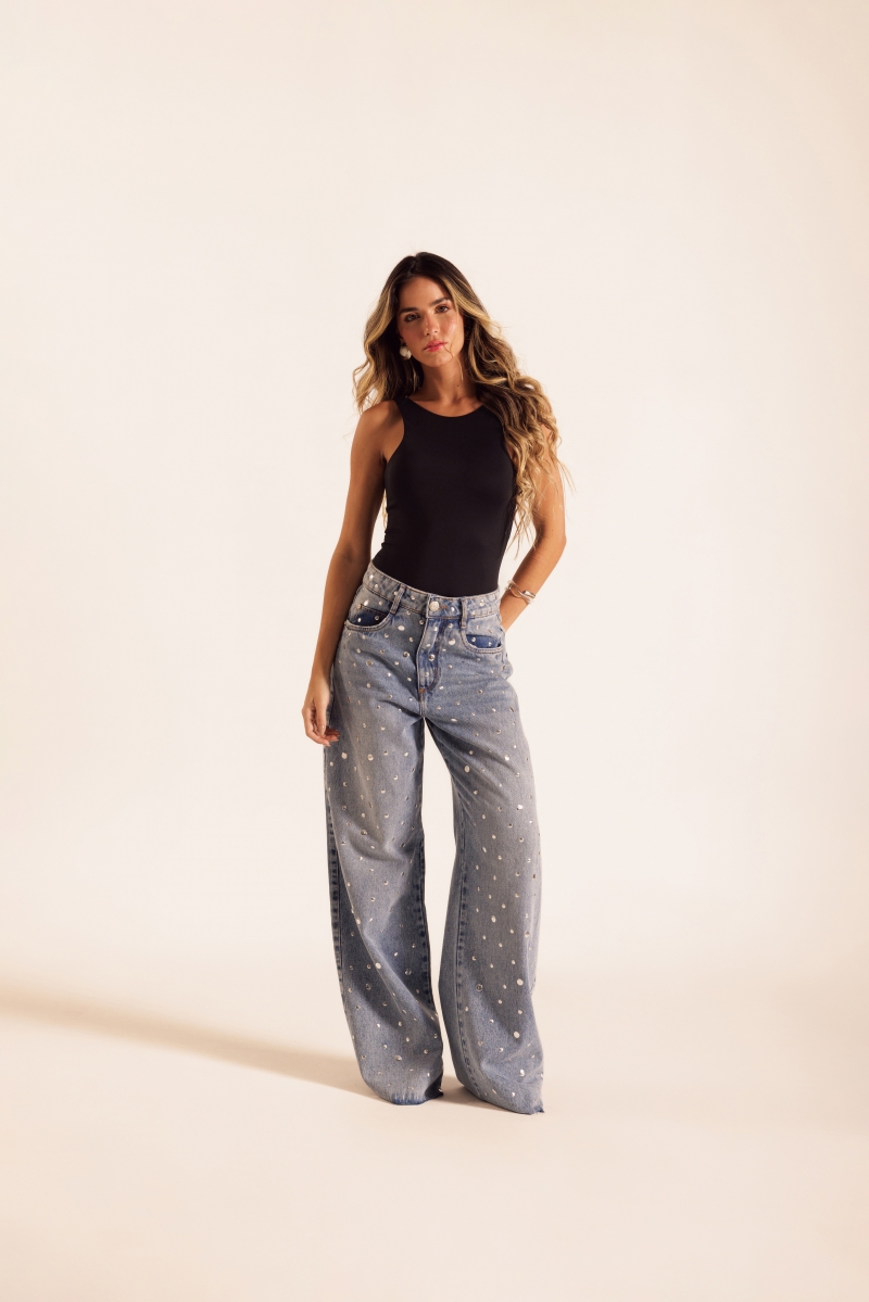 Calça Jeans Silver Shine em tecido 100% algodão, com aplicações de taxas prateadas distribuídas na parte frontal. Possui barra chuleada com detalhe levemente detonado, trazendo um toque despojado. Cós com passantes e bolsos funcionais.