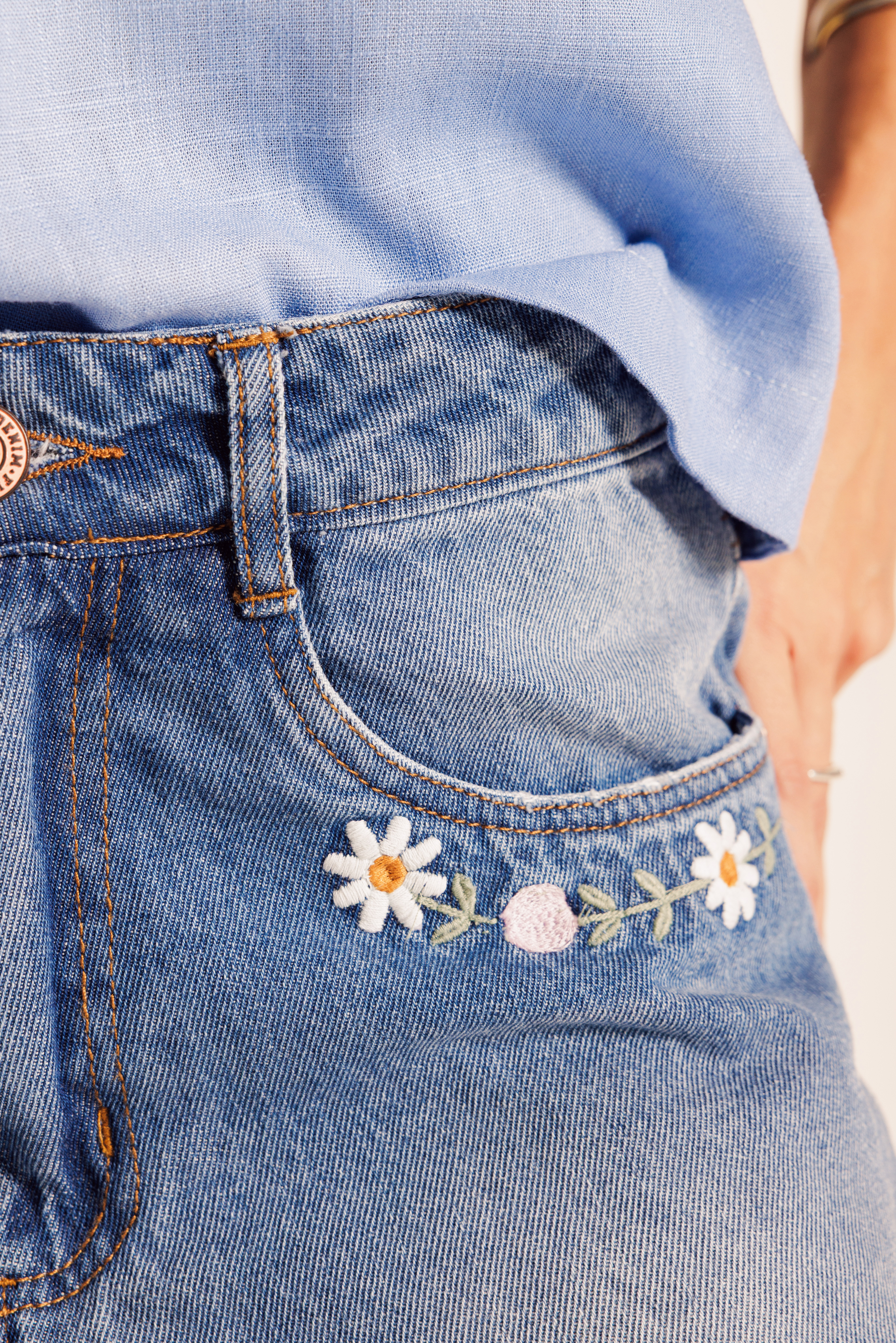 Short Jeans Star Gold em tecido 100% algodão, com bordados florais posicionados logo abaixo dos bolsos frontais. Possui barra desfiada e bolsos traseiros com detalhe, trazendo um toque diferenciado à peça.