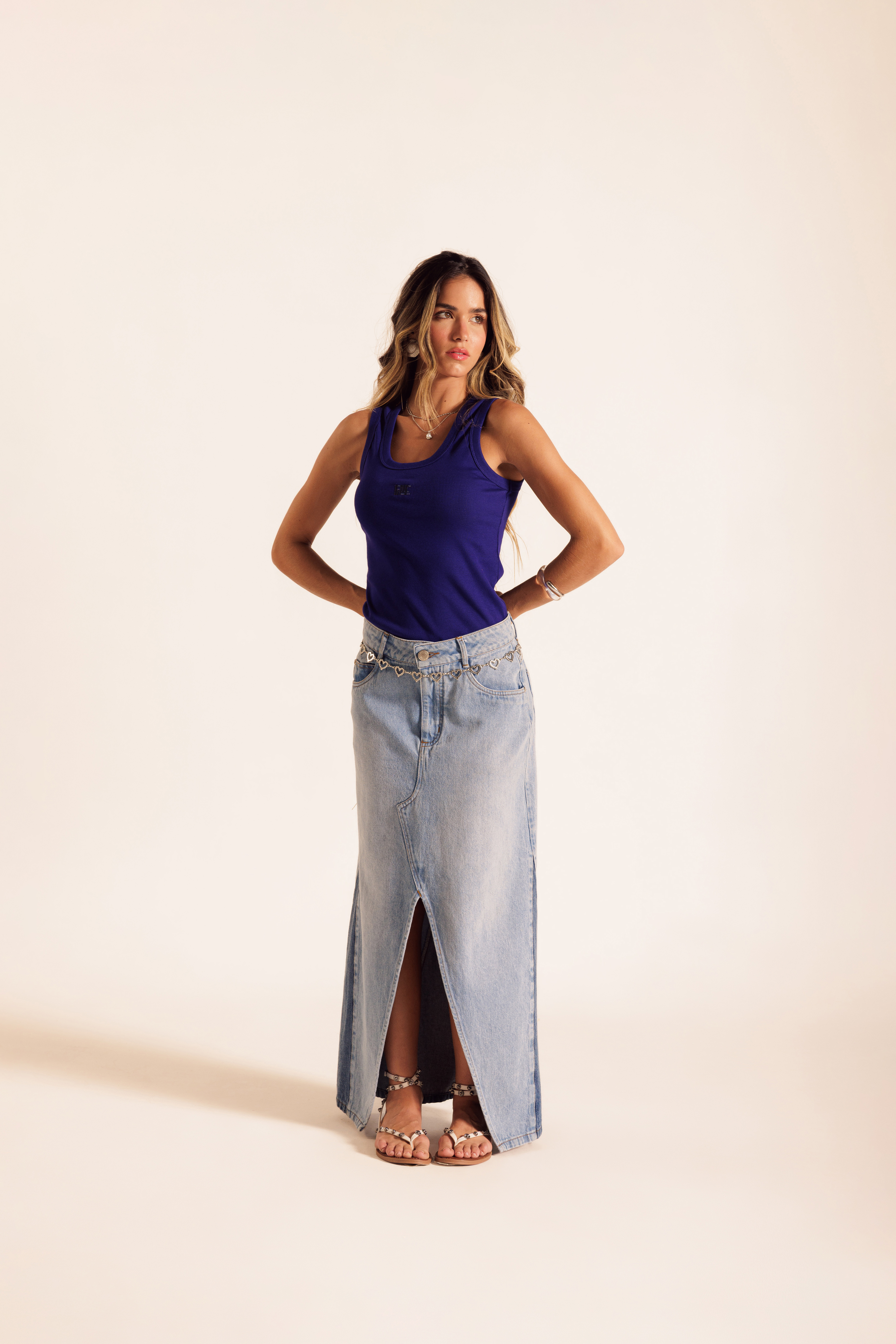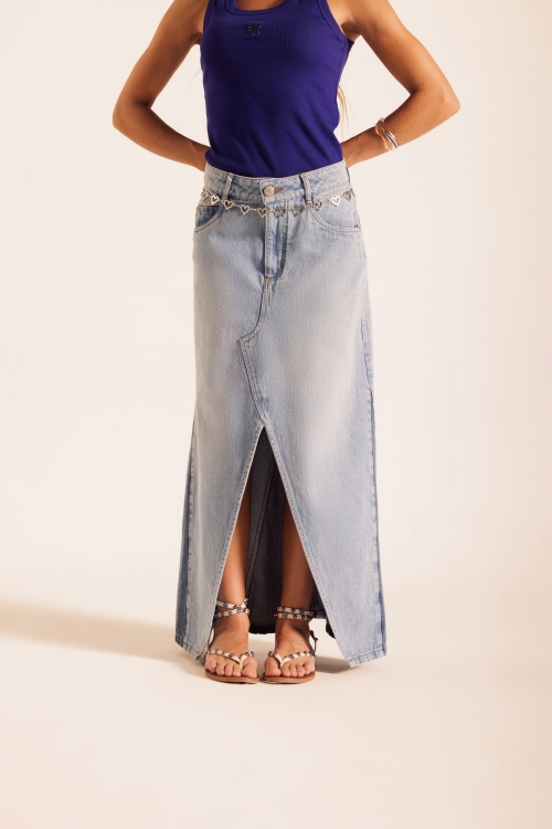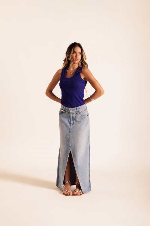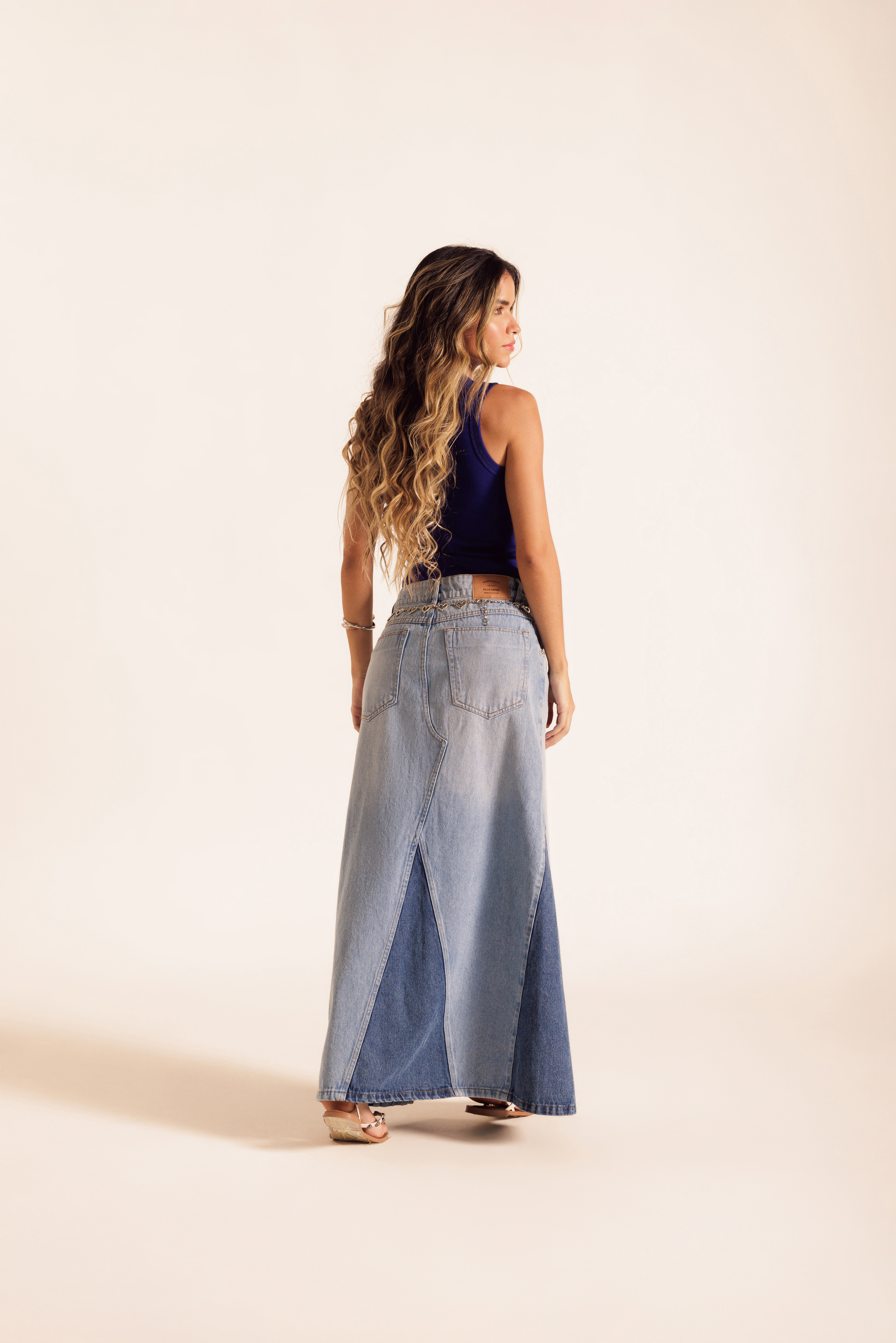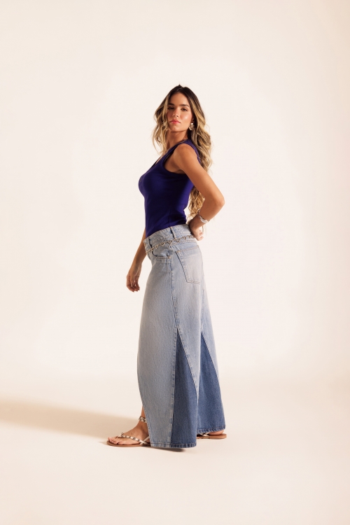 Saia Midi Nesgas Duo em duas lavagens, com recortes em nesgas que criam movimento e contraste. Possui fenda frontal que garante caimento moderno e confortável. Confeccionada em tecido 100% algodão.