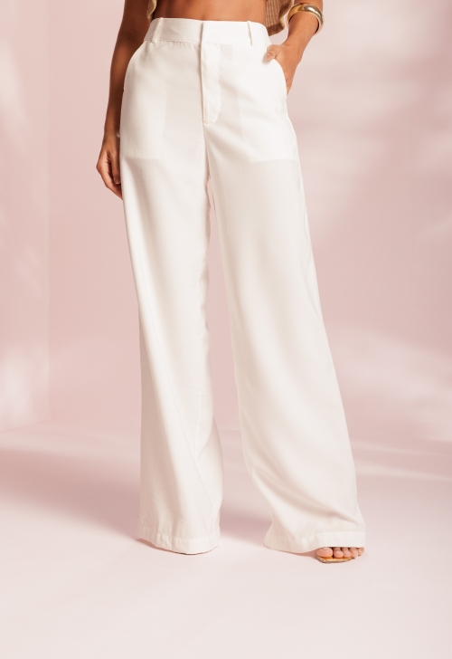 Calça Alfaiataria Nuvem, em tecido piquet. Com modelagem reta, bolso faca e fechamento por dois colchetes no cós. Cor off-white. Composição: 92% viscose e 8% poliéster.