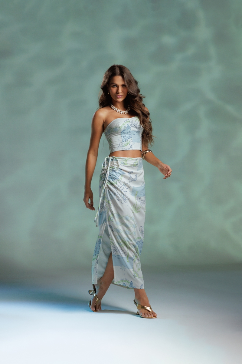 Saia Longuete Praieira com fenda lateral e detalhe franzido com amarração na lateral. Modelagem reta com caimento leve. Confeccionada em tecido 100% viscose.