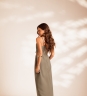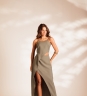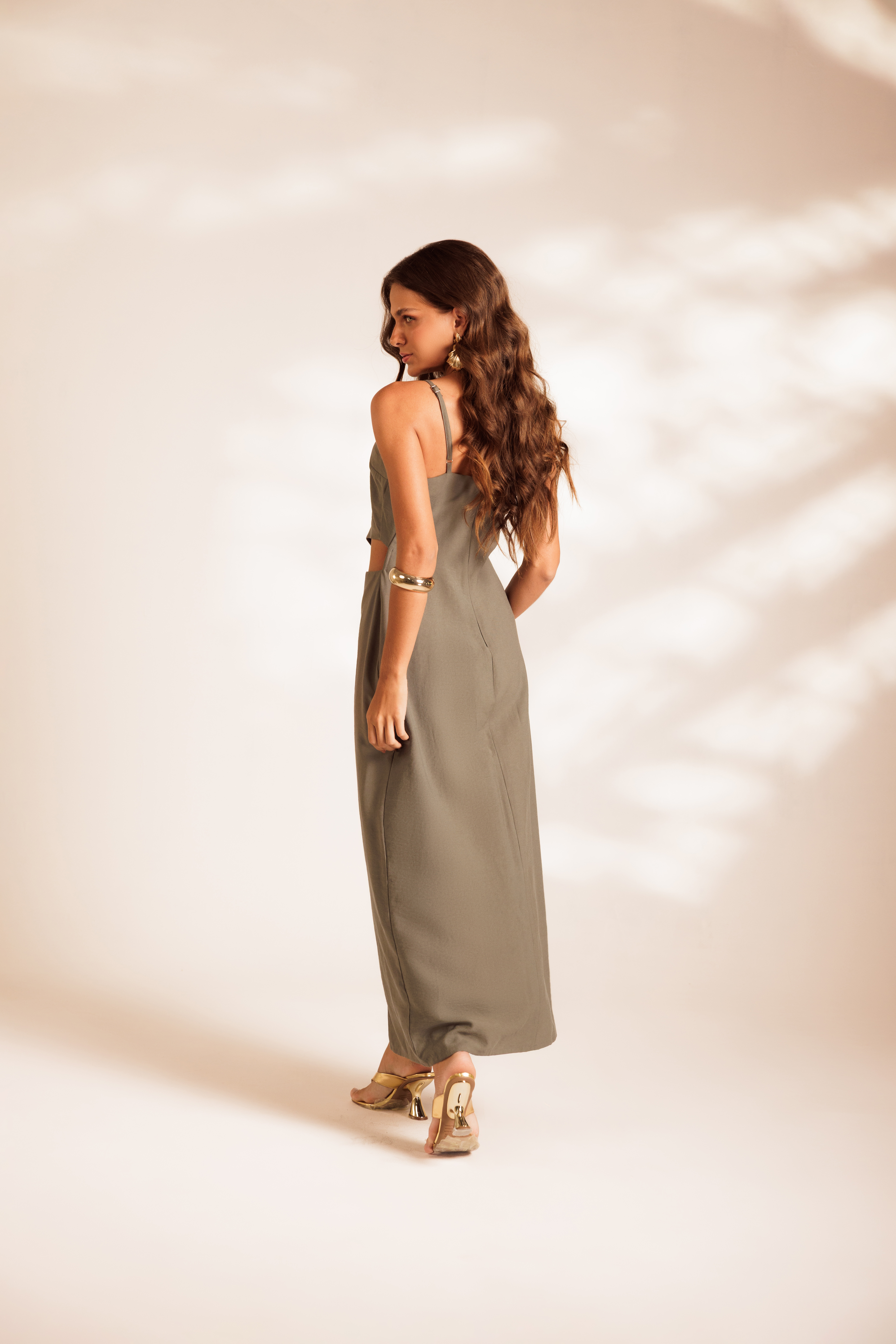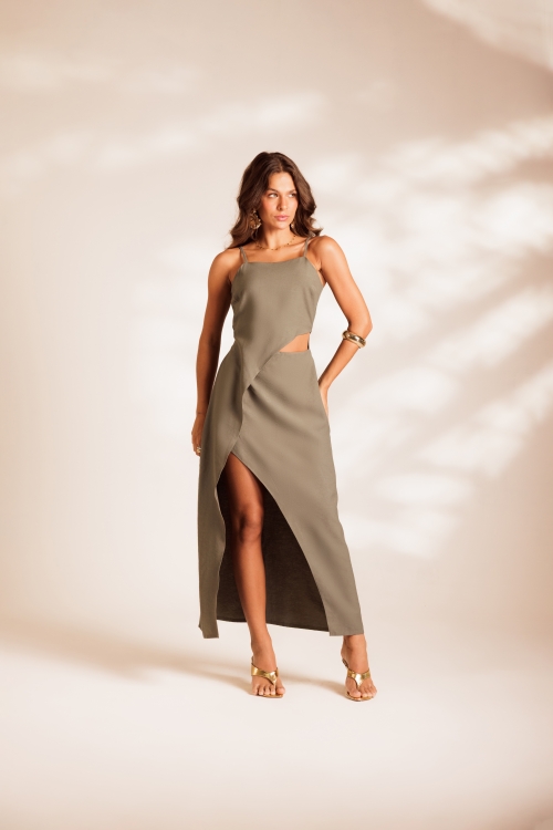 Vestido Recorts Wet Green com alças finas, recorte na cintura e fenda frontal que destaca o movimento da peça. Confeccionado em 92% viscose e 8% poliéster, tem toque leve e caimento moderno.