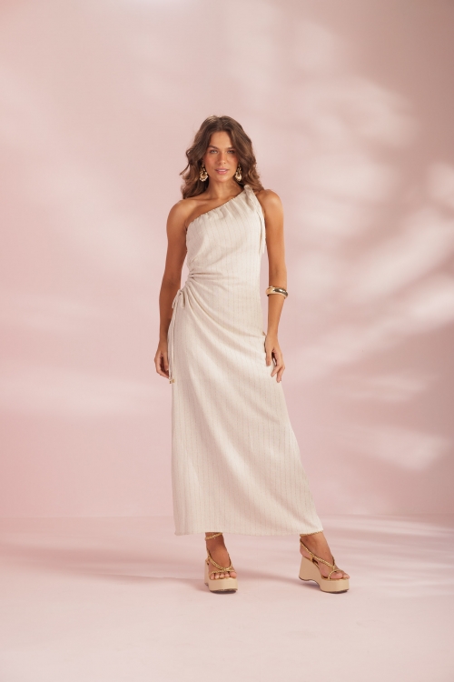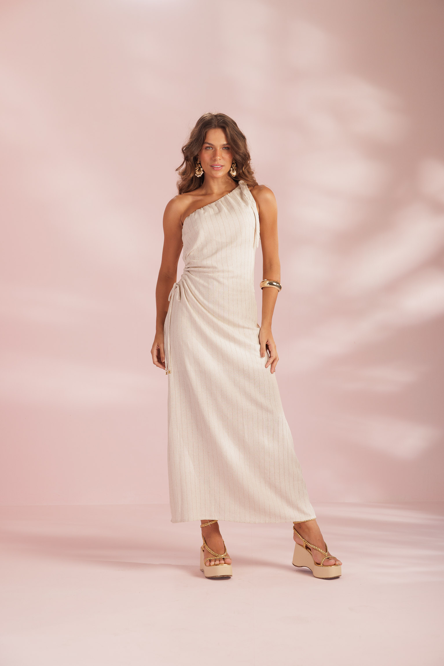 Vestido Midi Sunshine de um ombro só com amarração no ombro e rolotê ajustável nas laterais. Confeccionado em tecido 80% viscose, 16% linho e 4% outras fibras.