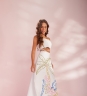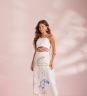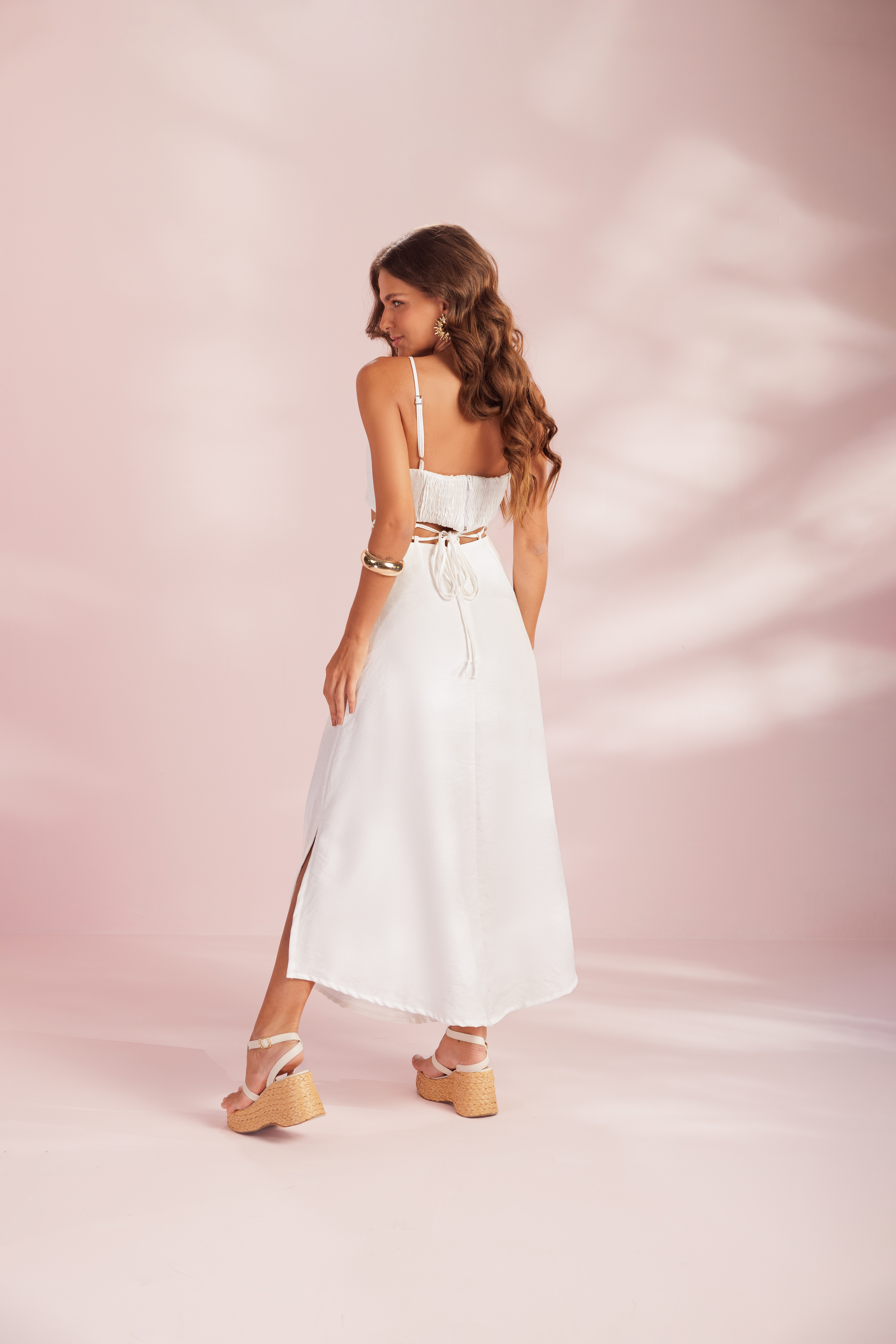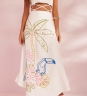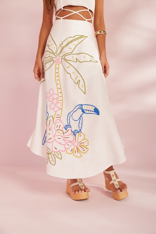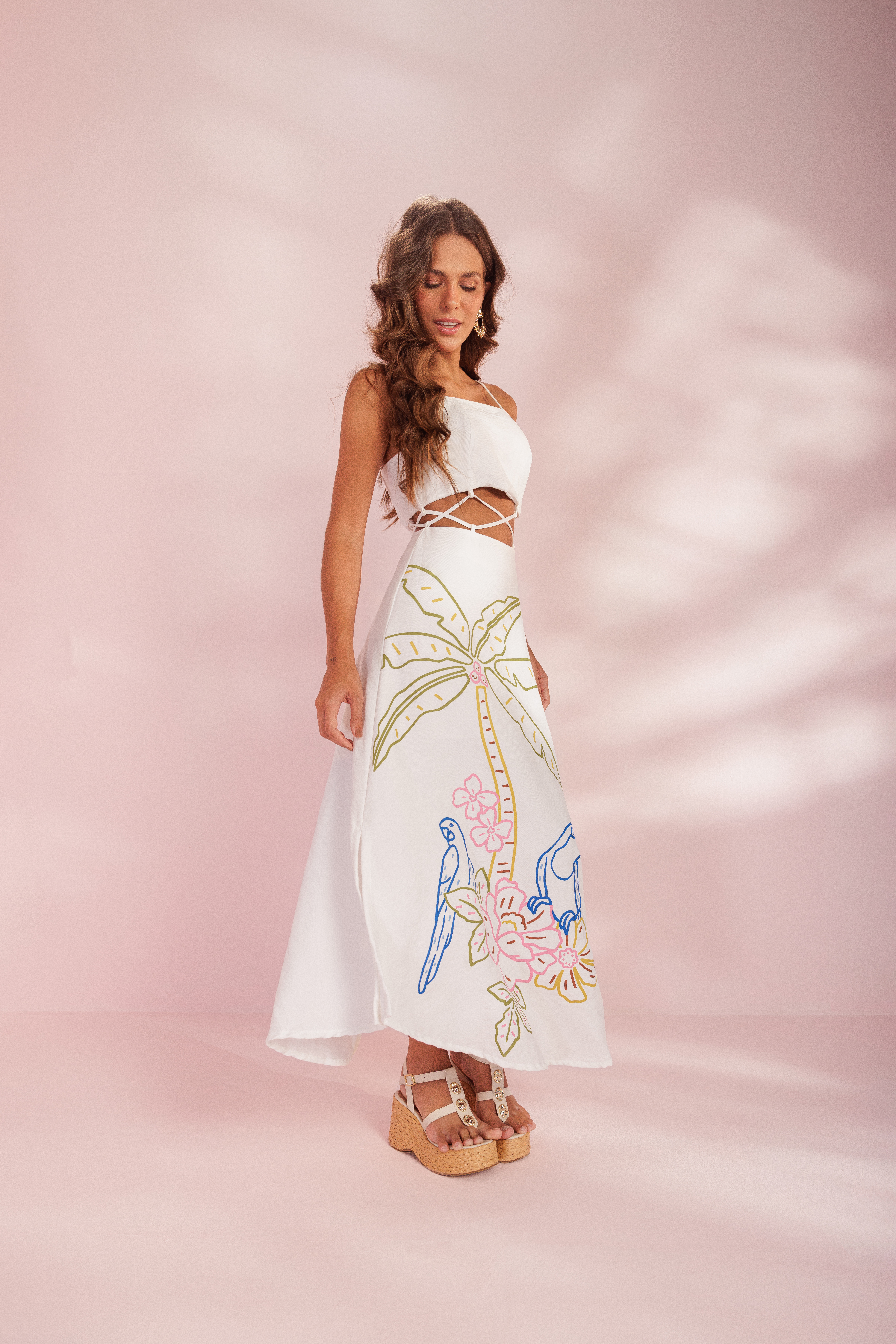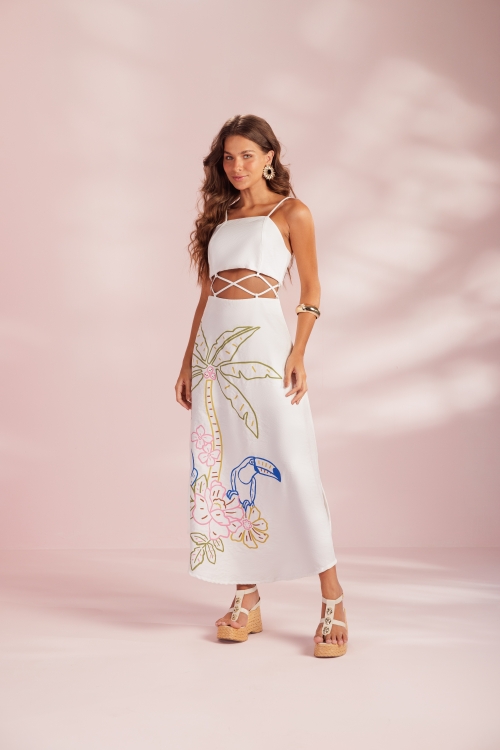 Vestido longo com recorte frontal e amarração, trazendo pintura tropical com coqueiro, flores e tucano que deixa o visual leve e bem verão. Tecido: 92% viscose 8% poliester.