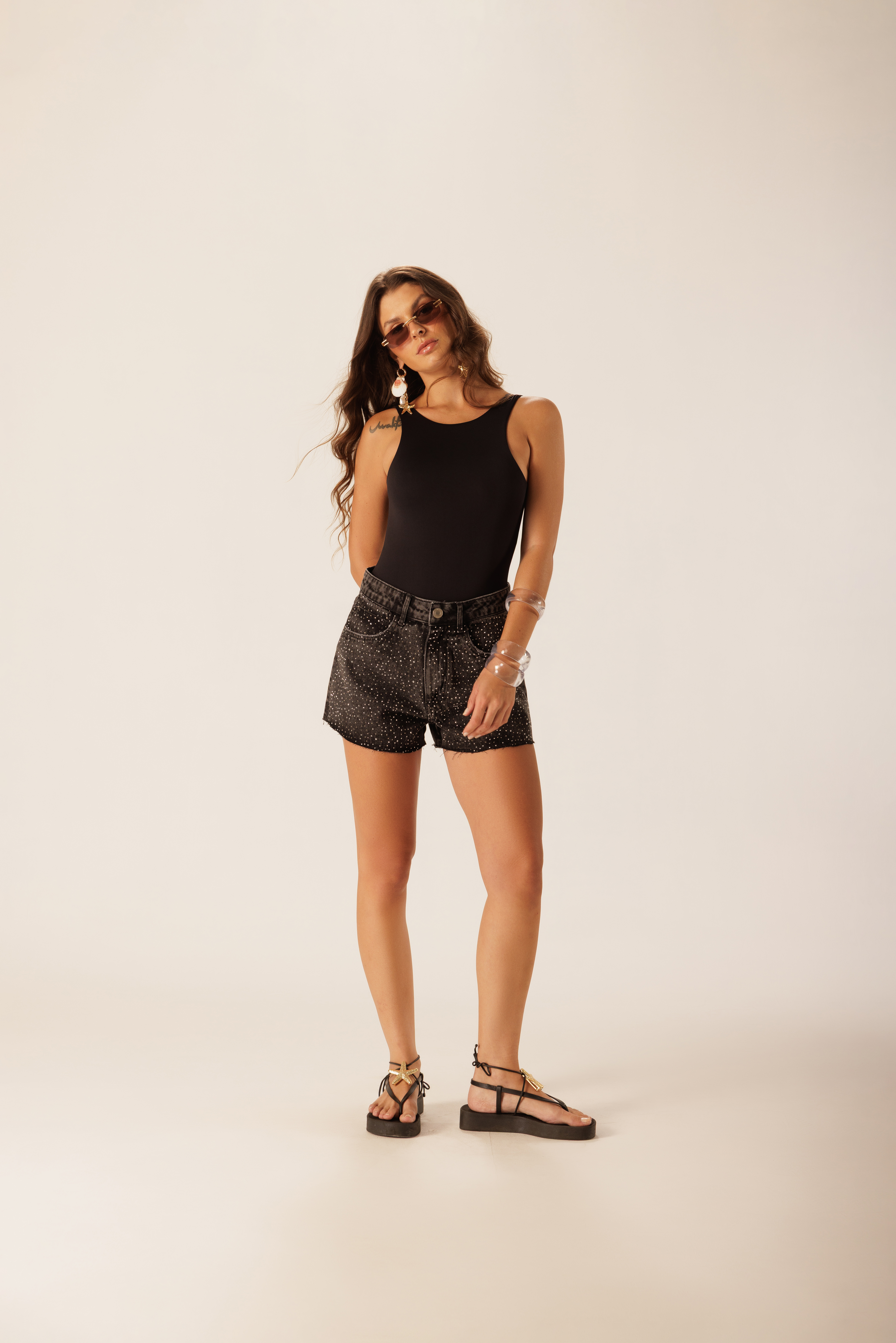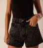 Short Jeans Essence Dark com aplicação de strass por toda a frente, criando um efeito pontilhado que destaca a lavagem escura. A barra chuleada traz um acabamento despojado, feito em tecido 100% algodão que garante conforto e boa estrutura ao vestir.