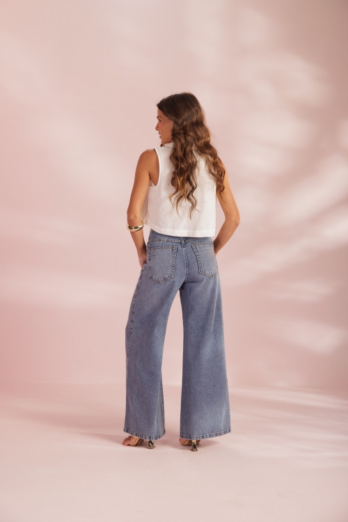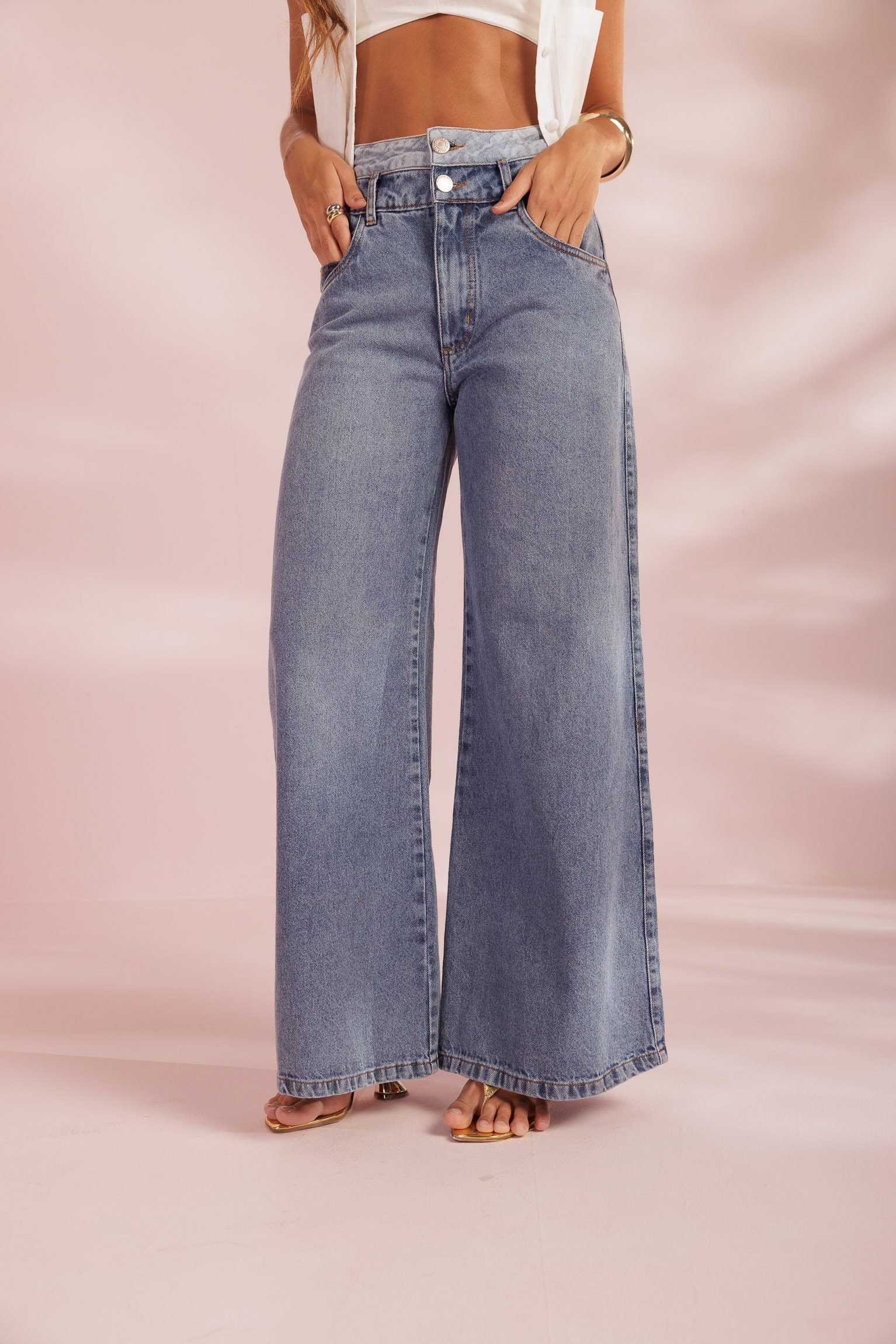 Calça Duo Denim de caimento amplo com cós duplo em duas lavagens, criando contraste sutil que chama atenção no visual. Modelagem confortável, bolsos funcionais e tecido 100% algodão que garante estrutura e uso fácil no dia a dia.