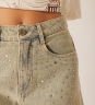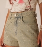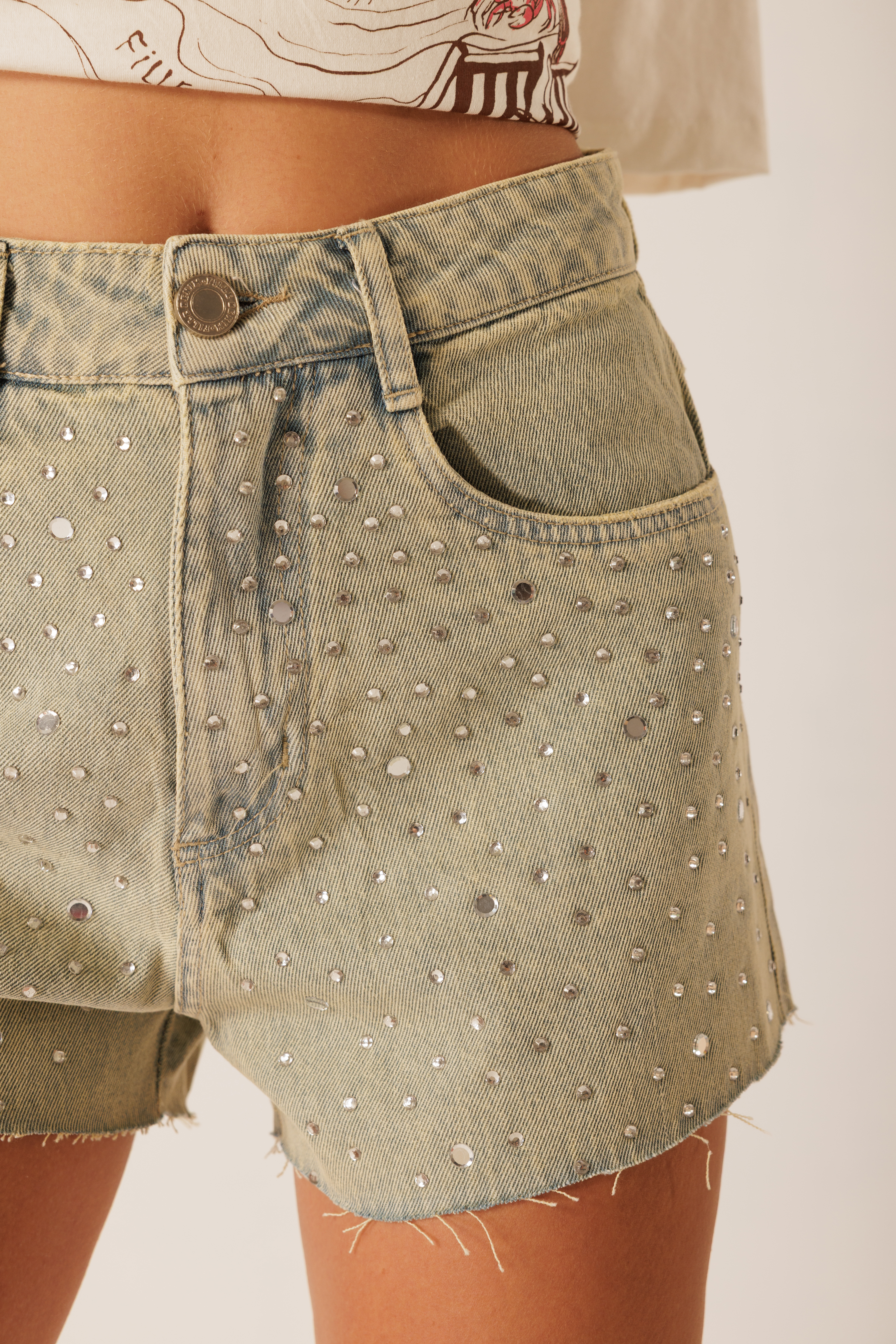 Short Jeans Brilho de Verão curto em lavagem clara, com barra levemente asa delta e acabamento desfiado. A frente recebe aplicação de strass espalhados, trazendo brilho pontual ao jeans 100% algodão.