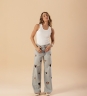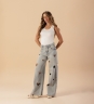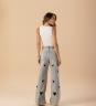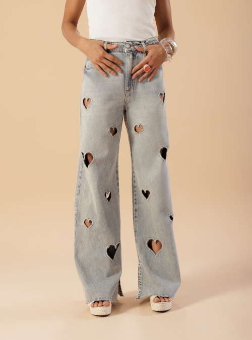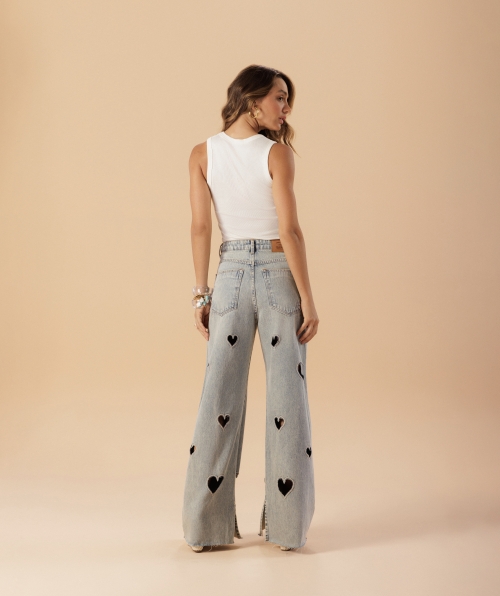 Calça em algodão com modelagem wide leg, trazendo caimento amplo e confortável. Possui bordados de coração na frente e nas costas, que adicionam um toque moderno e cheio de personalidade à peça. Perfeita para compor looks despojados com destaque nos detalhes.