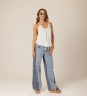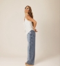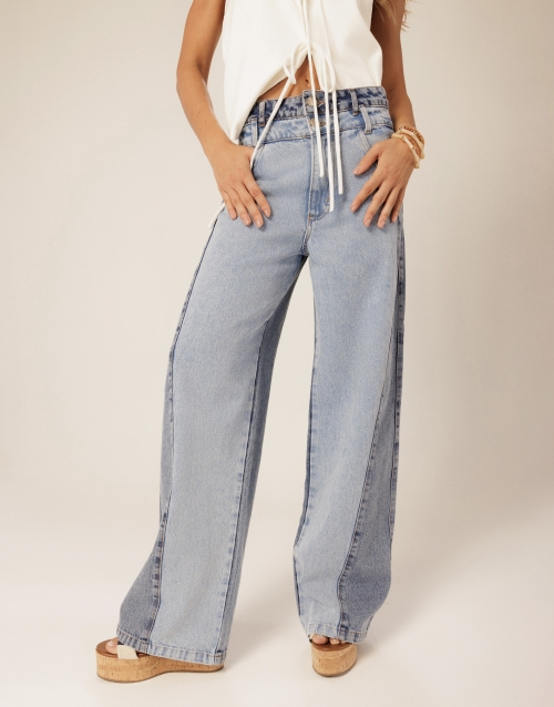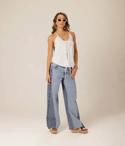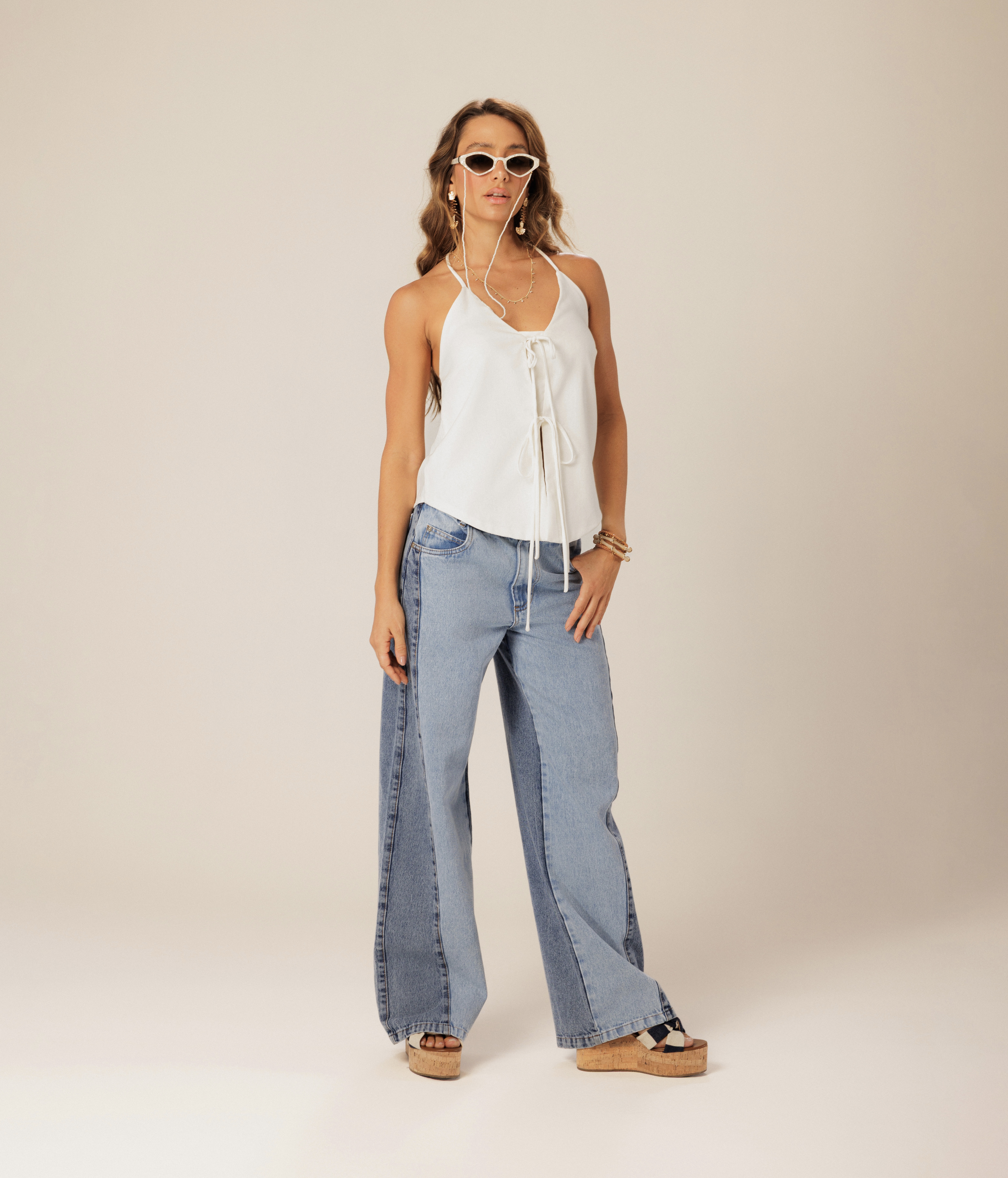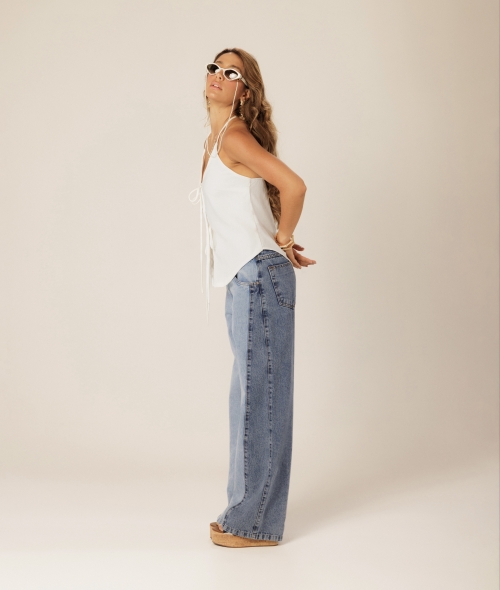 Calça em algodão com modelagem wide leg, trazendo caimento amplo e confortável. O diferencial fica por conta dos dois tons de jeans, que criam contraste moderno e deixam a peça ainda mais estilosa e versátil para o dia a dia.
