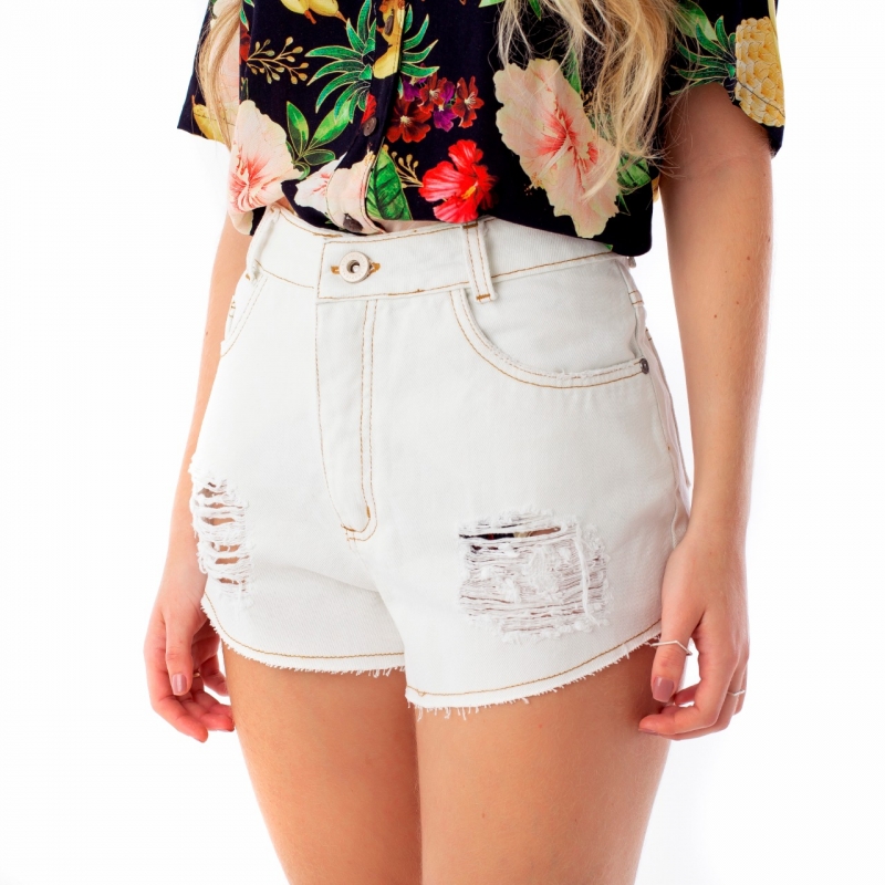 Short desenvolvido em tecido jeans de gramatura mediana, fechamento por zíper e botão, detonadinhos frontais e barra cortada.