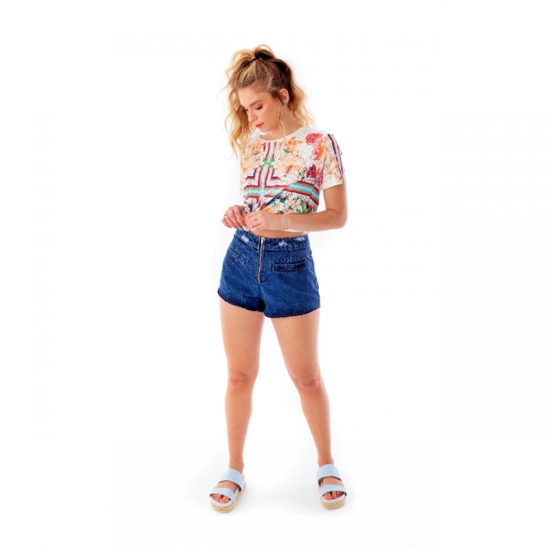 Short desenvolvido em tecido jeans médio, bolsos verdugos frontais e zíper aparente! Lavagem escura com barrinha cortada.