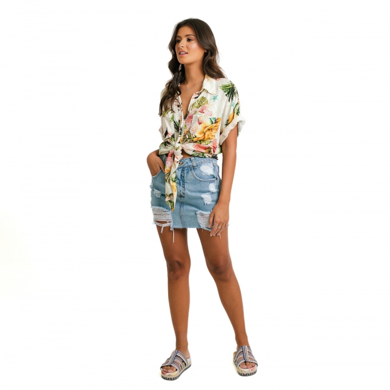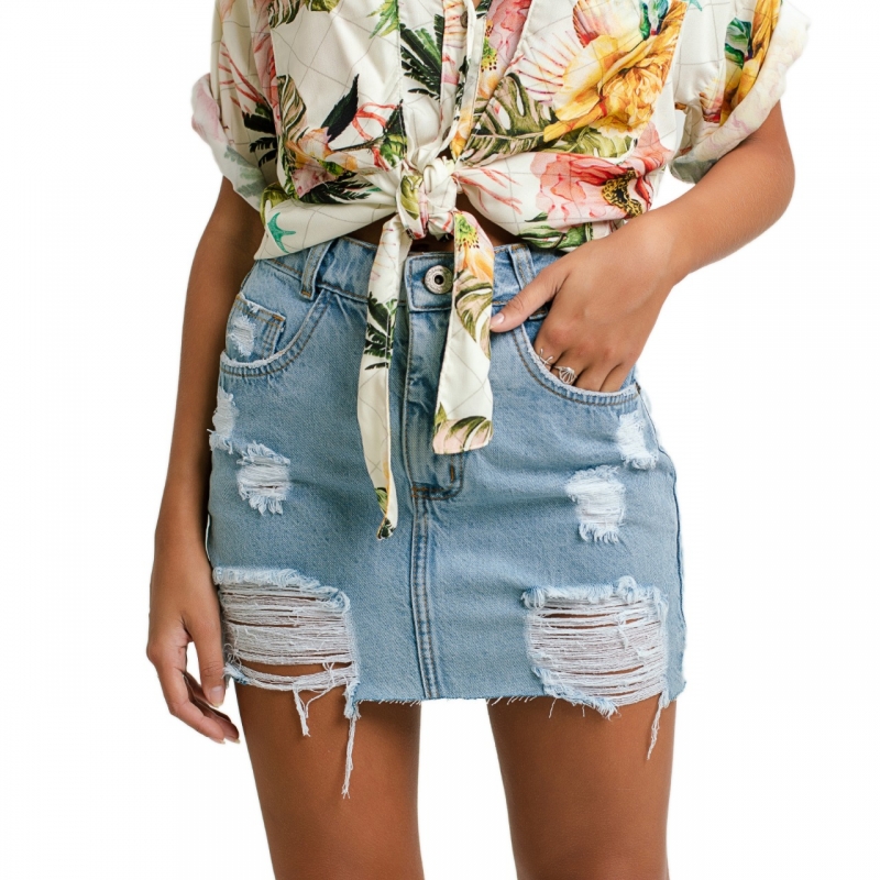 Saia jeans desenvolvida em tecido de gramatura média, tem modelagem cintura intermediária e detonados frontais por toda peça com lavagem clara.