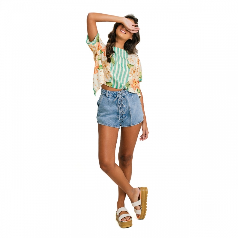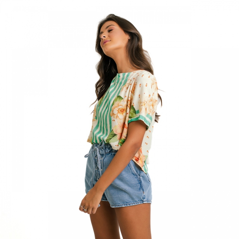 Cropped desenvolvida em tecido viscose, decote costas e estampa exclusiva de abacaxi floral.