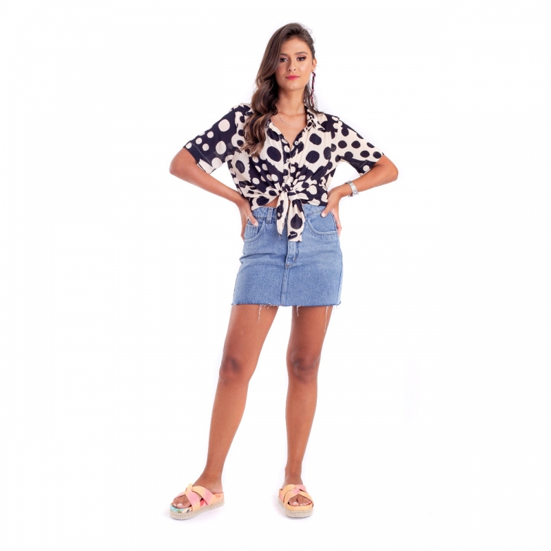 Saia desenvolvida em tecido jeans, modelagem cintura alta, passantes no cós e fechamento por zíper e botão.