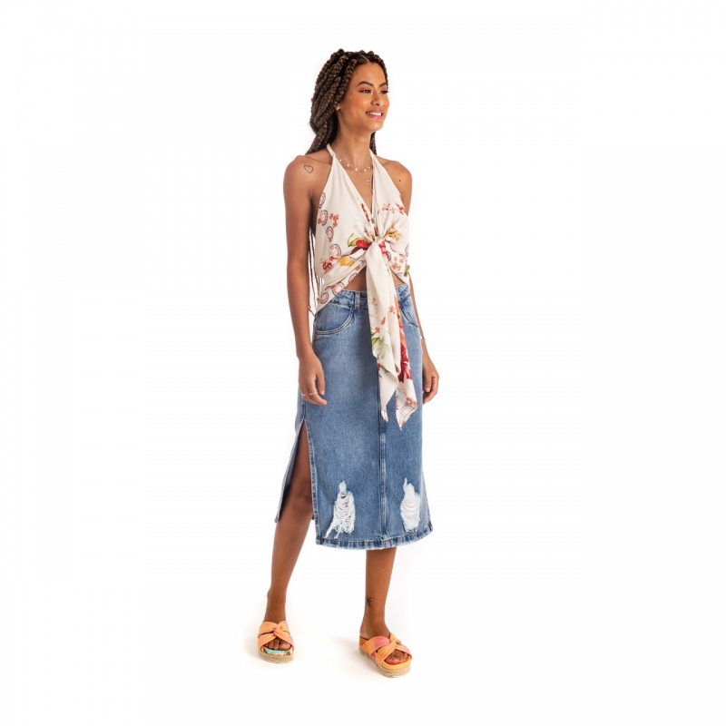 Blusa lenço desenvolvida em tecido viscose, alças de torçal, botão frontal aparente e estampa floral.