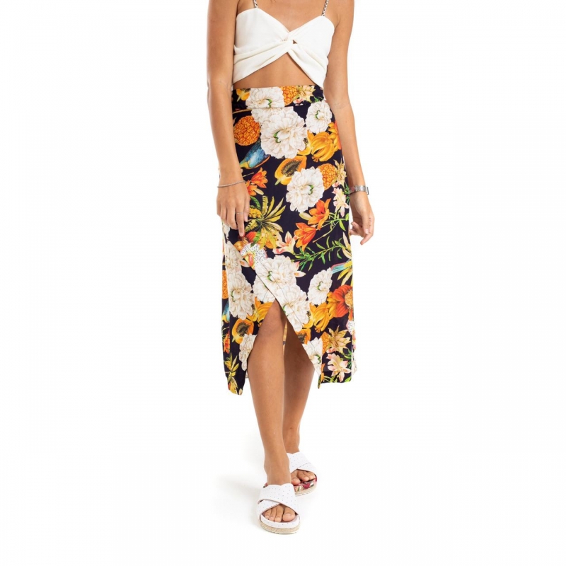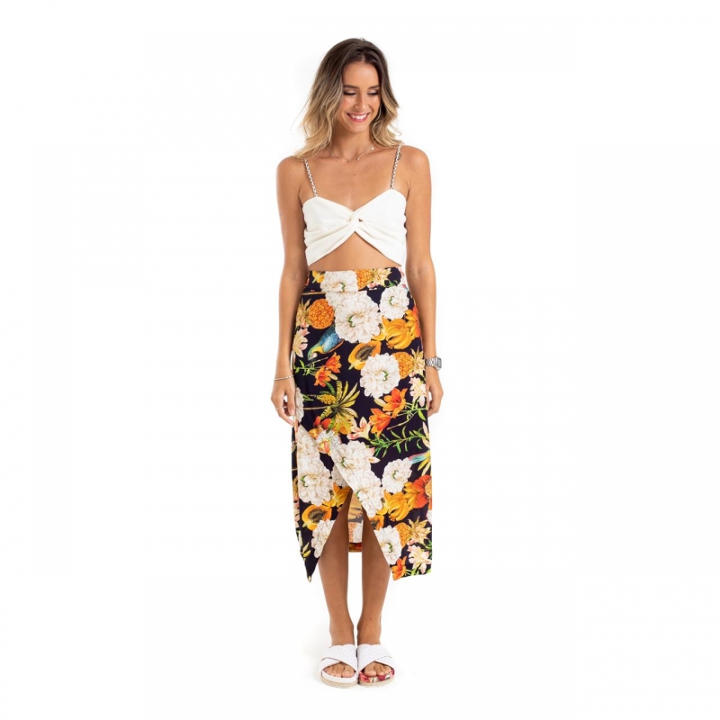 Saia desenvolvida em tecido viscose, modelagem cintura alta, abertura frontal e estampa floral.