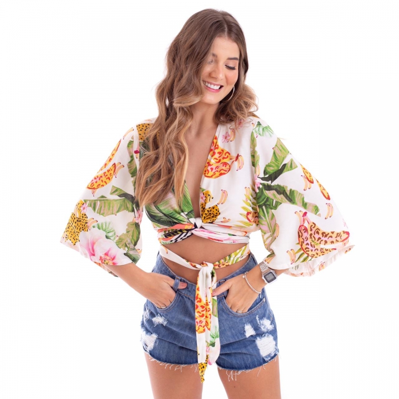 Cropped desenvolvida em tecido viscose, decote transpasse e estampa de banana onça.