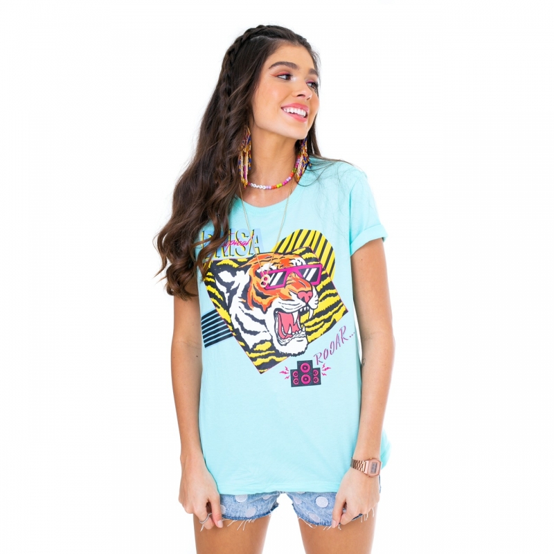T-Shirt desenvolvida em tecido algodão, modelagem padrão e silk frontal.