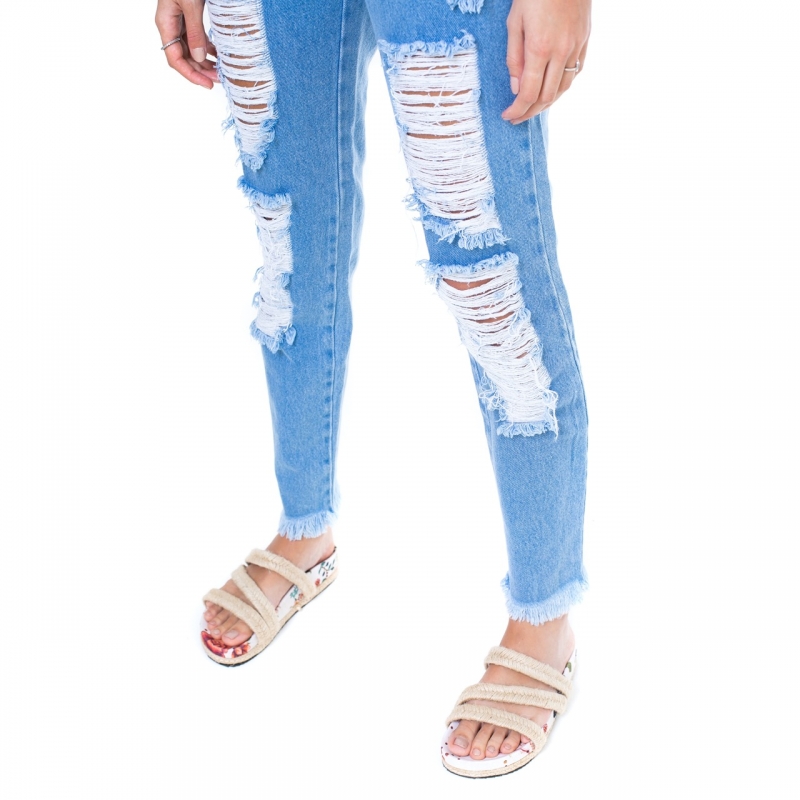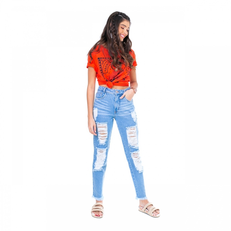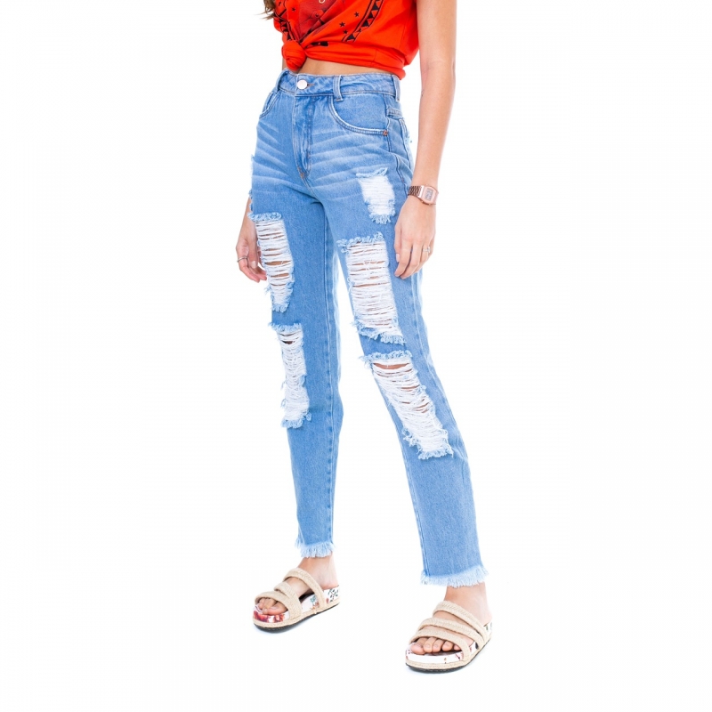 Calça desenvolvida em tecido 100% algodão, modelagem intermediária, detonados frontais e barra desfiada.