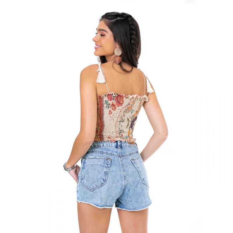 Short desenvolvido em tecido jeans, modelagem cintura alta, cós desfiado e botões frontais com modelagem cintura alta.