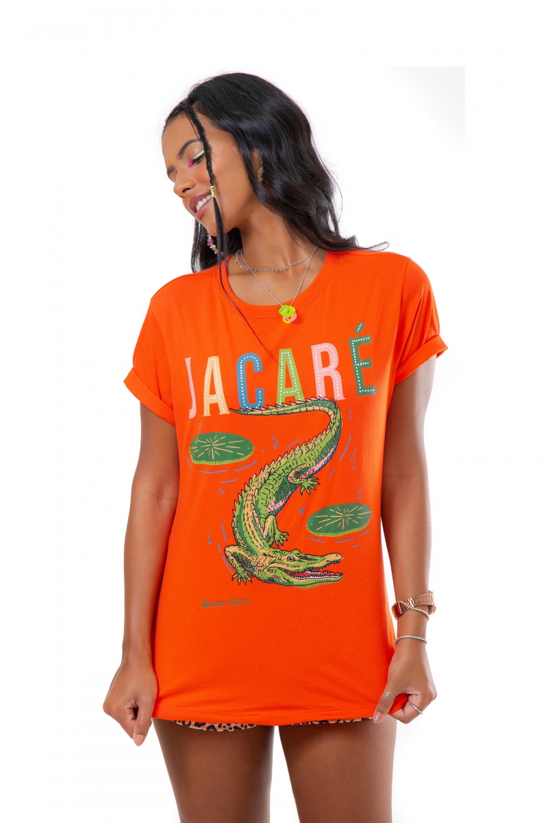T-Shirt desenvolvida em tecido algodão, modelagem padrão e silk frontal.