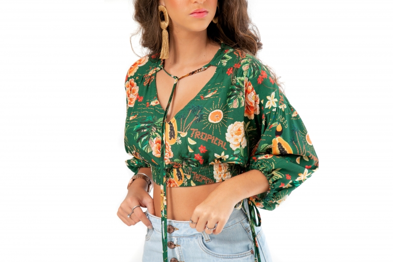 Cropped desenvolvida em tecido viscose, elástico embutido e amarração frontal com estampa floral.
