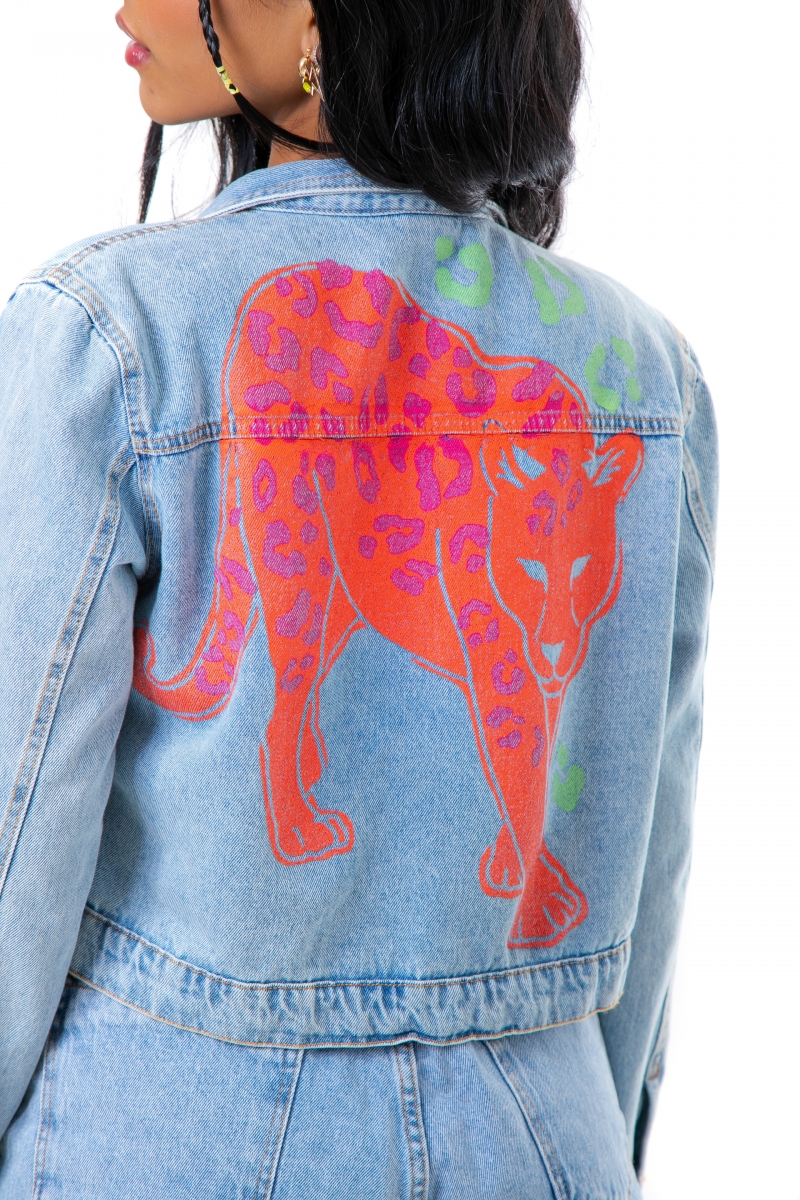 Jaqueta desenvolvida em tecido jeans de gramatura média, modelagem ampla e costas com desenho.