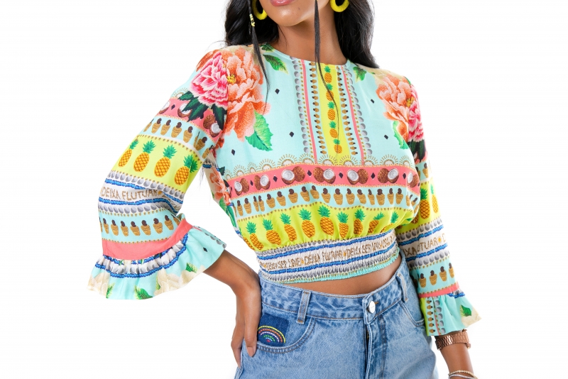 Cropped desenvolvida em tecido viscose e mangas com babados.