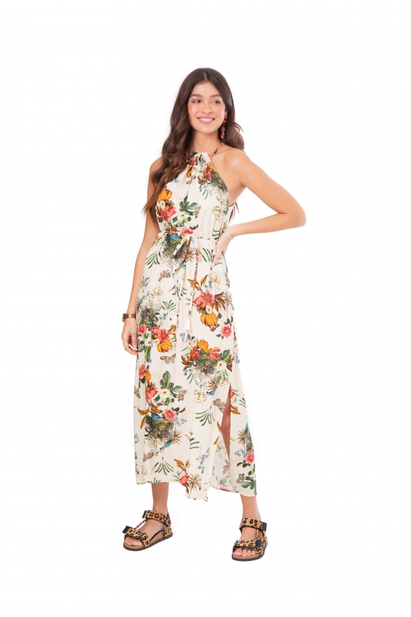 Vestido desenvolvido em tecido viscose, estampa floral, fendas laterais, e amarração opcional.