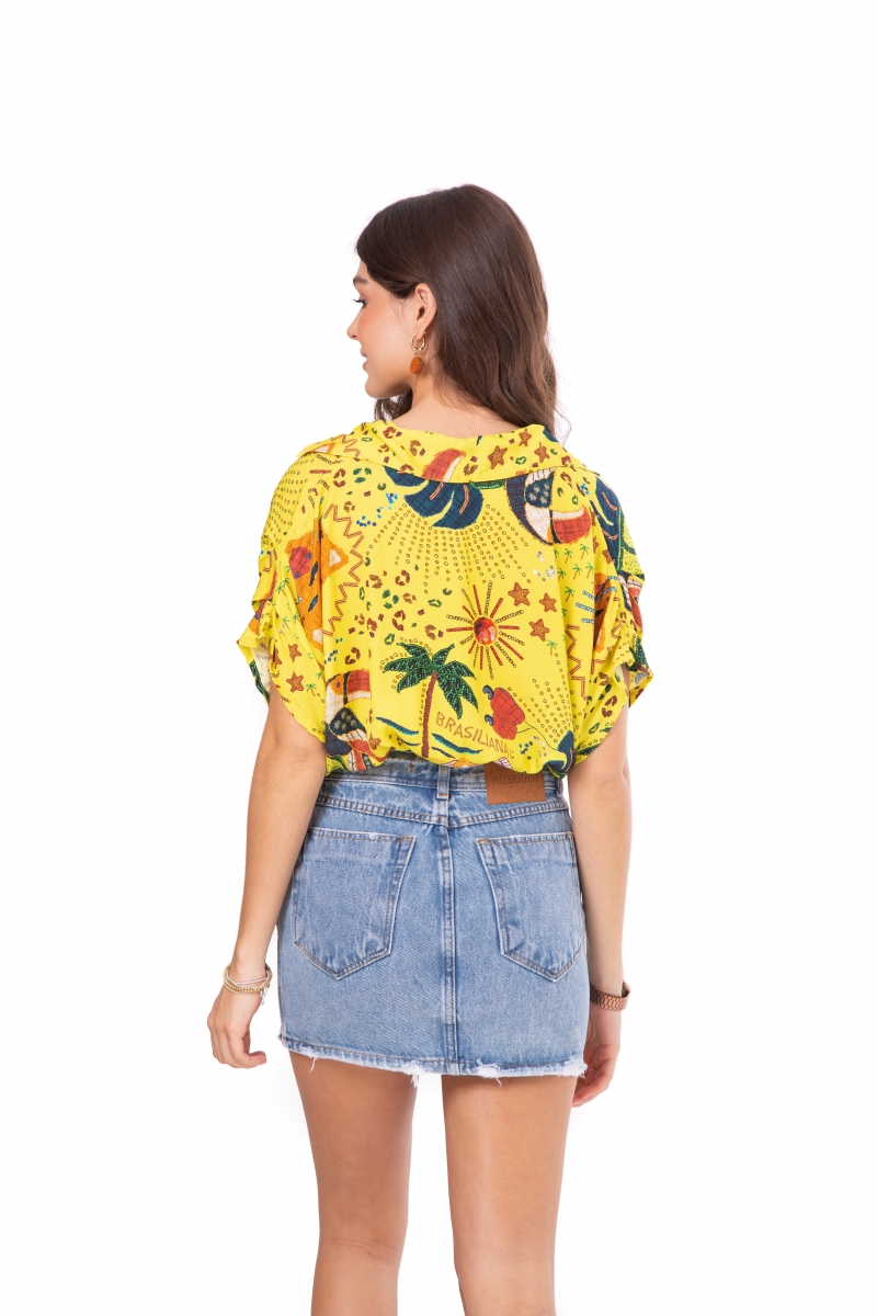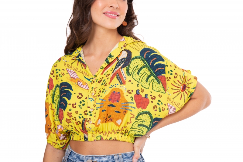 Cropped desenvolvida em tecido viscose, gola e botões frontais e elástico embutido na barra.