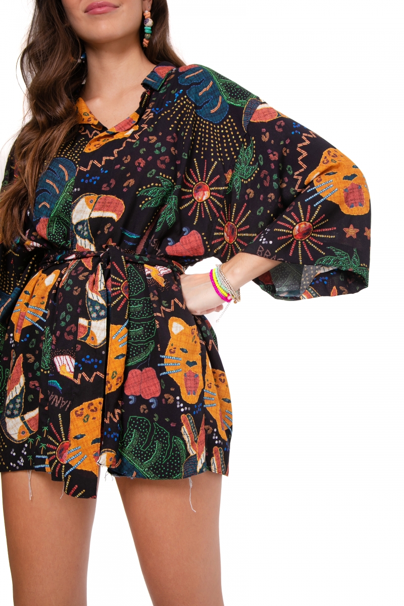 Kimono desenvolvido em tecido viscose, modelagem ampla e amarração opcional.