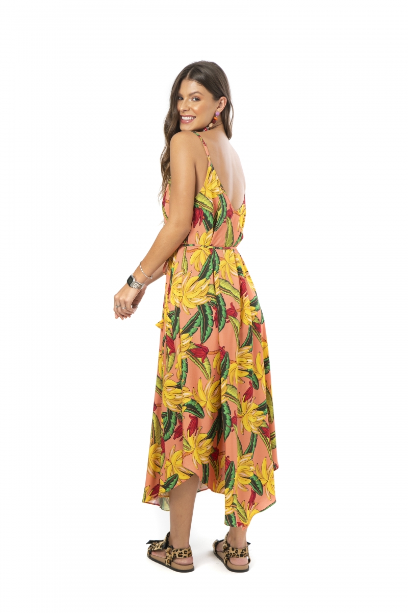 Vestido desenvolvido em tecido viscose, alças reguláveis, cinto para amarração e estampa de bananas.