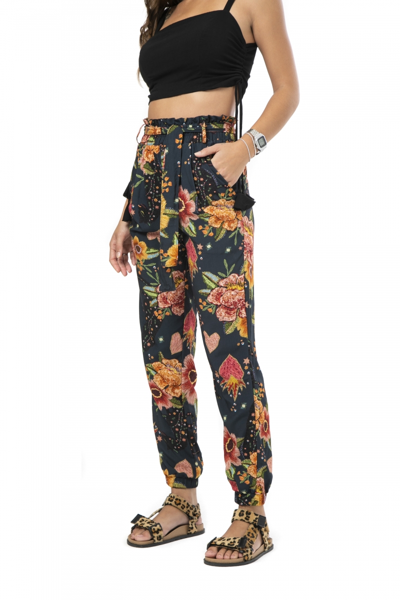 Calça desenvolvida em tecido viscose, modelagem cintura alta com elástico embutido no cós e faixa para amarração.