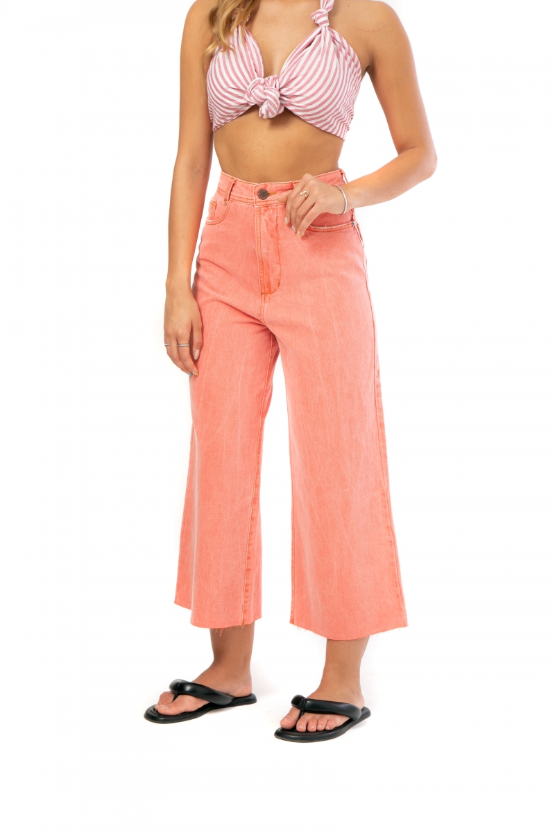 Calça panta desenvolvida em tecido jeans de gramatura média, passantes no cós e modelagem cintura alta.