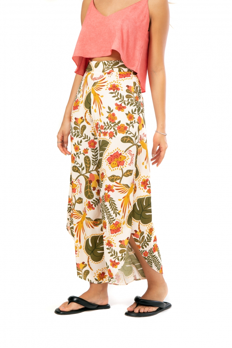 Pantacourt desenvolvida em tecido viscose, modelagem cintura alta, corte assimétrico e estampa tropicalia.