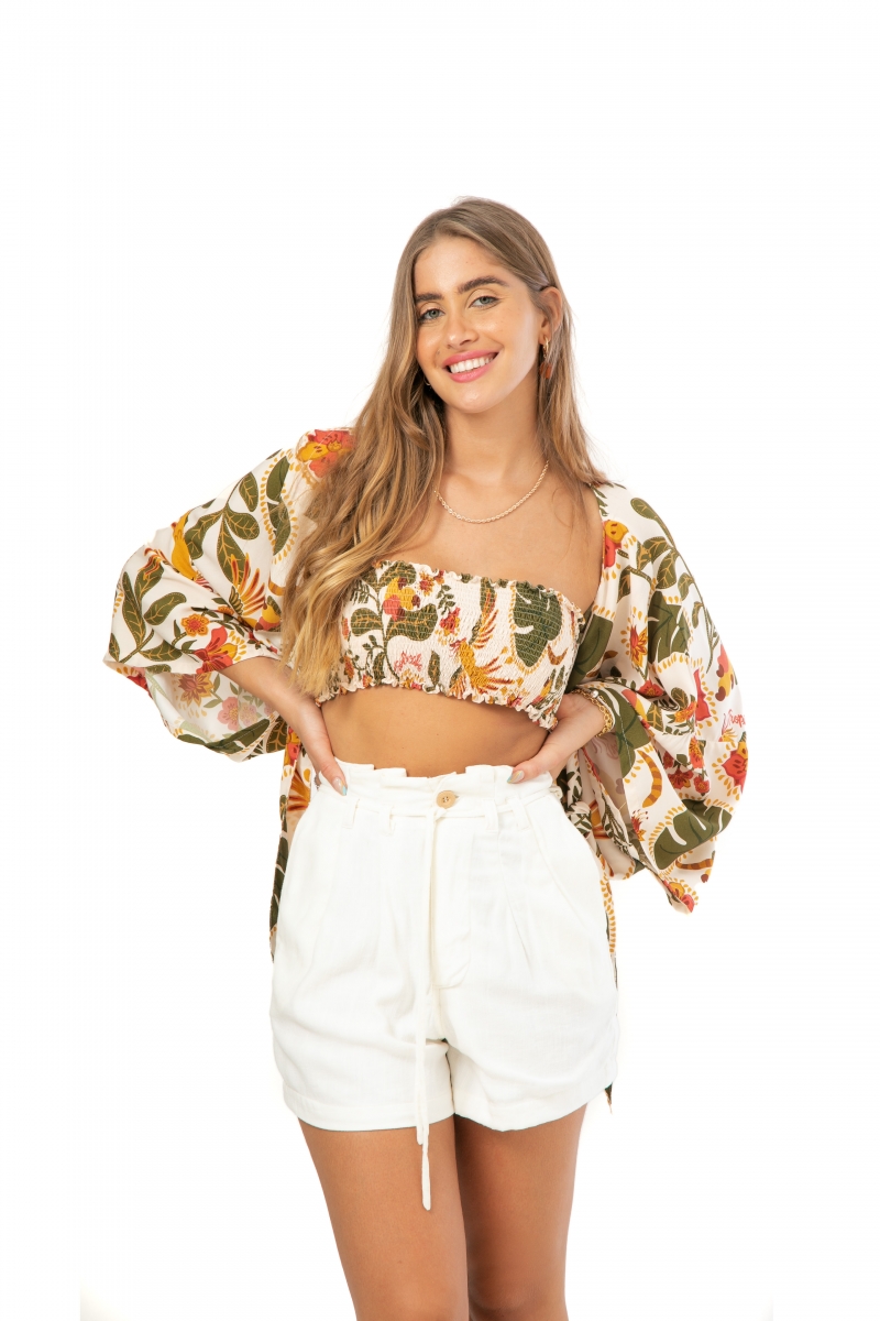 Shorts desenvolvido em tecido viscose com linho, pregas, modelagem clochard, e amarração frontal.