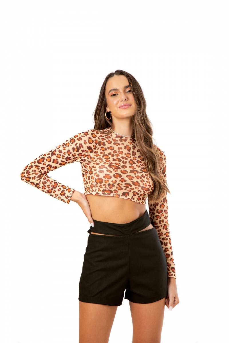 Shorts desenvolvido em tecido linho, recortes vazados frontais e fecho por zíper.